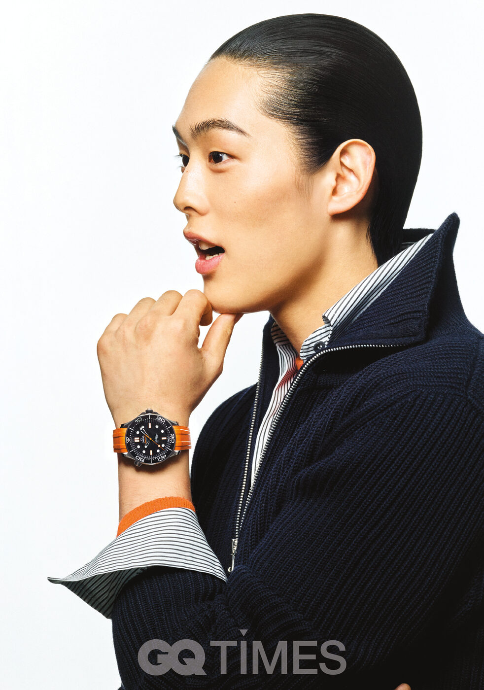 양극 산화 가공으로 내마모성과 내부식성을 갖춘 베젤이 어떤 모험도 떠날 수 있을 것만 같은 자신감을 불러일으킨다. 오렌지 컬러가 스트랩, 초침, 쿼터 인덱스 등에 적용돼 경쾌함을 더한다. 씨마스터 다이버 300M 42밀리미터 9백만원대, 오메가. 네이비 집업, 안데르센 안데르센 a t 샌프란시스코 마켓. 블랙 스트라이프 셔츠, 유돈초이. 오렌지 톱, 폴스미스.
