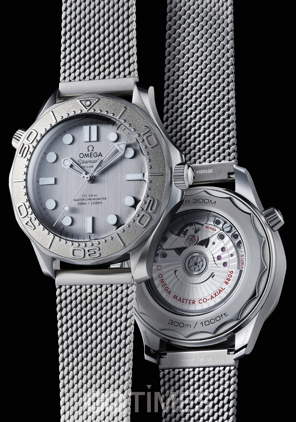 견고한 티타늄 베젤에 양각으로 다이빙 스케일을 새겼다. 300미터 방수 기능과 헬륨 가스 배출 밸브로 다이버의 전문성를 고려하는 동시에, 다이얼은 브러싱 가공해 한층 세련된 디자인으로 완성했다. 씨마스터 다이버 300M 42밀리미터 1천만원대, 오메가.