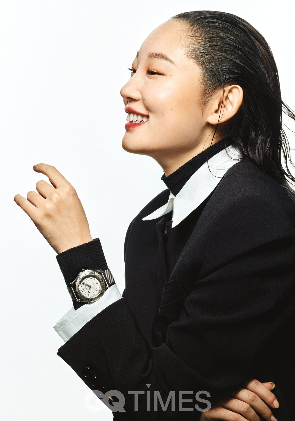 견고한 티타늄 베젤에 양각으로 다이빙 스케일을 새겼다. 300미터 방수 기능과 헬륨 가스 배출 밸브로 다이버의 전문성를 고려하는 동시에, 다이얼은 브러싱 가공해 한층 세련된 디자인으로 완성했다. 씨마스터 다이버 300M 42밀리미터 1천만원대, 오메가. 칼라리스 싱글 재킷, 렉토. 화이트 셔츠, 잉크. 블랙 터틀넥, 비비안 웨스트우드.