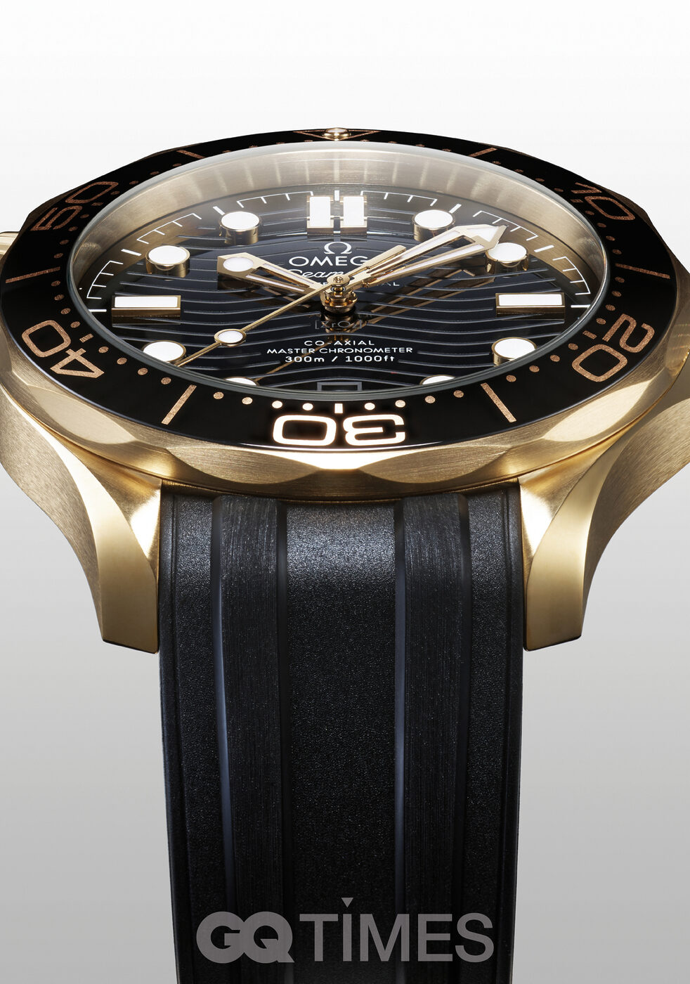 수면 위에서는 18K 세드나 골드 케이스가, 수면 아래에서는 화이트 슈퍼 루미노바를 칠한 볼록한 인덱스가 다이버의 손목을 밝힌다. 다이얼의 물결 패턴은 레이저 각인으로 정교하게 완성했다. 씨마스터 다이버 300M 42밀리미터 1천3백만원대, 오메가.