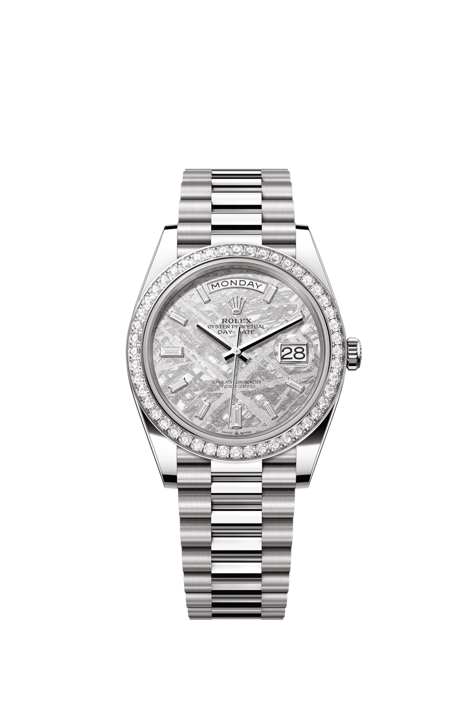 데이데이트 40은 10개의 바게트 컷 다이아몬드가 세팅된 메테오라이트 다이얼, 그리고 다이아몬드 세팅 베젤이 특징인 모델이다. 가공이 까다로운 철질운석이 얇게 커팅되고 화학 공정을 거친 뒤 보이는 구조 ‘비드만스테텐’이 아름답다. 자사 제작 칼리버 3255가 탑재됐고 약 70시간의 파워 리저브 기능을 제공한다. 9,458만 원.