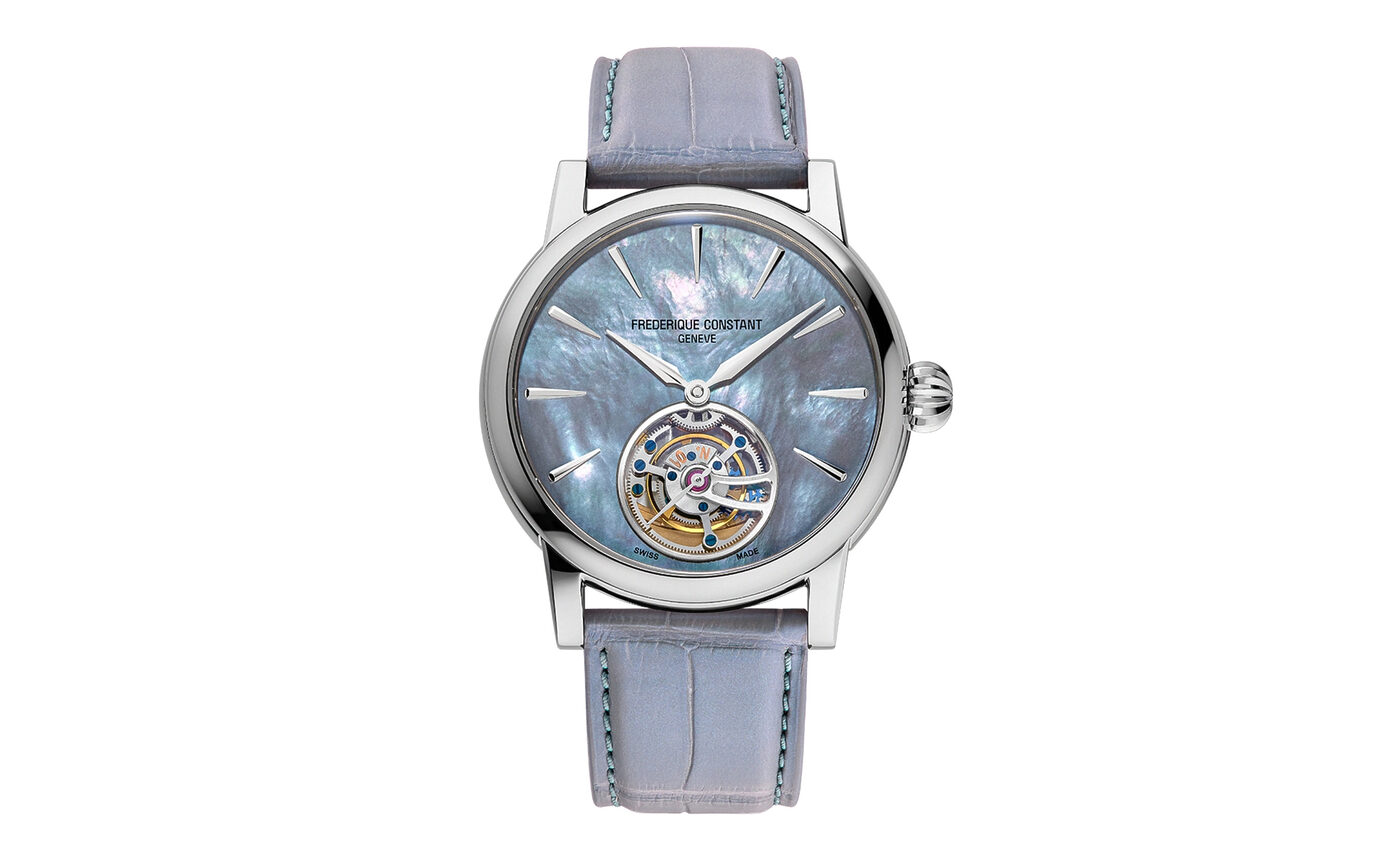 뛰어난 광채에 걸맞은 가격. 프레드릭 콘스탄트의 클래식 투르비용과 마더 오브 펄이 결합한 모델 매뉴팩처는 일반 모델보다 약 10배 비싸게 출시됐다. 기교와 복잡성이 조화를 이루는 이 모델은 36개 한정 생산됐으며 FC-980-4 오토매틱 칼리버로 구동된다. 18캐럿 화이트 골드의 39mm 케이스는 마더 오브 펄의 그레이와 블루 컬러를 부드럽게 아우른다. 6,374만 원.