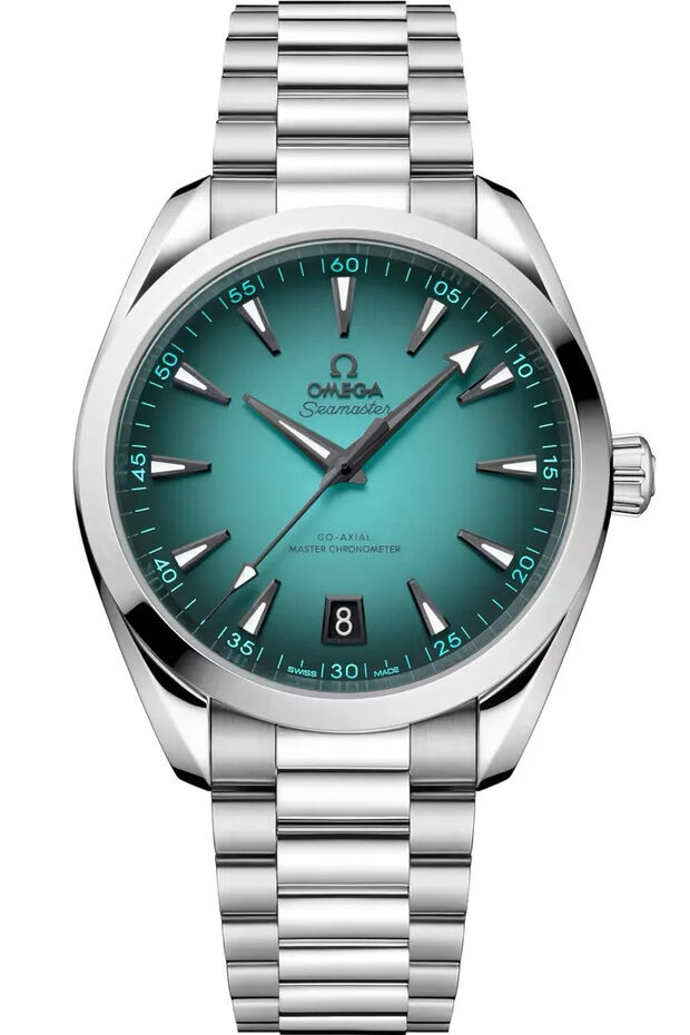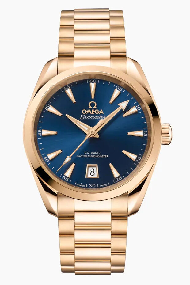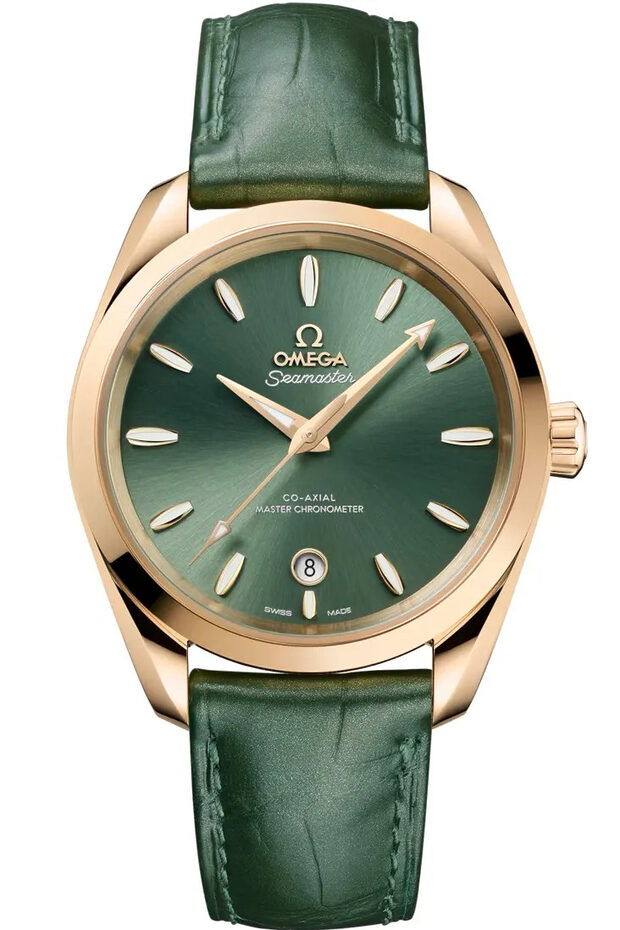 그린 다이얼과 문샤인 골드 케이스를 조합한 이 오메가 씨마스터 아쿠아 테라는 그 자체로 남우조연상 수상자라는 문구가 새겨진 듯한 시계다.