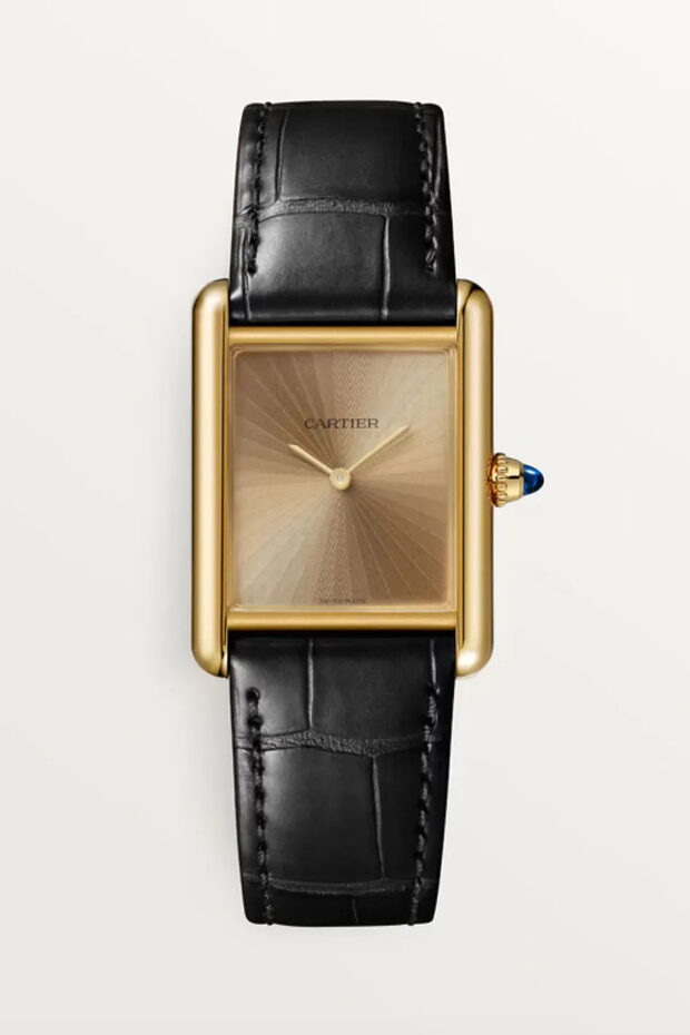 파인은 과하지 않고 클래식한 블랙 턱시도에 골드 선레이 다이얼과 옐로 골드 케이스를 갖춘 새로운 탱크 루이 까르띠에를 매치했다.