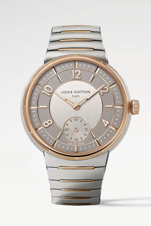 2023년 새롭게 단장한 루이 비통의 땅부르 컬렉션은 스틸과 18캐럿 로즈 골드를 조합한 투톤 모델로, 화이트의 손목에서 존재감을 드러냈다.