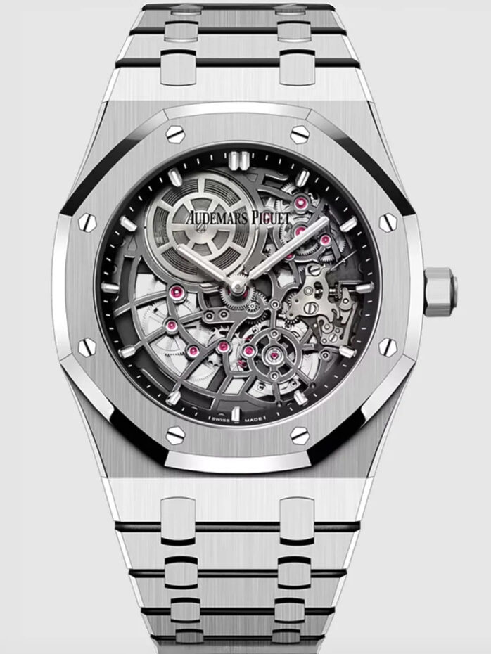 화이트 골드 버전의 로열 오크 점보 엑스트라 씬은 블랙 온 블랙 턱시도와 대비되며 더욱 강렬하게 빛났다.