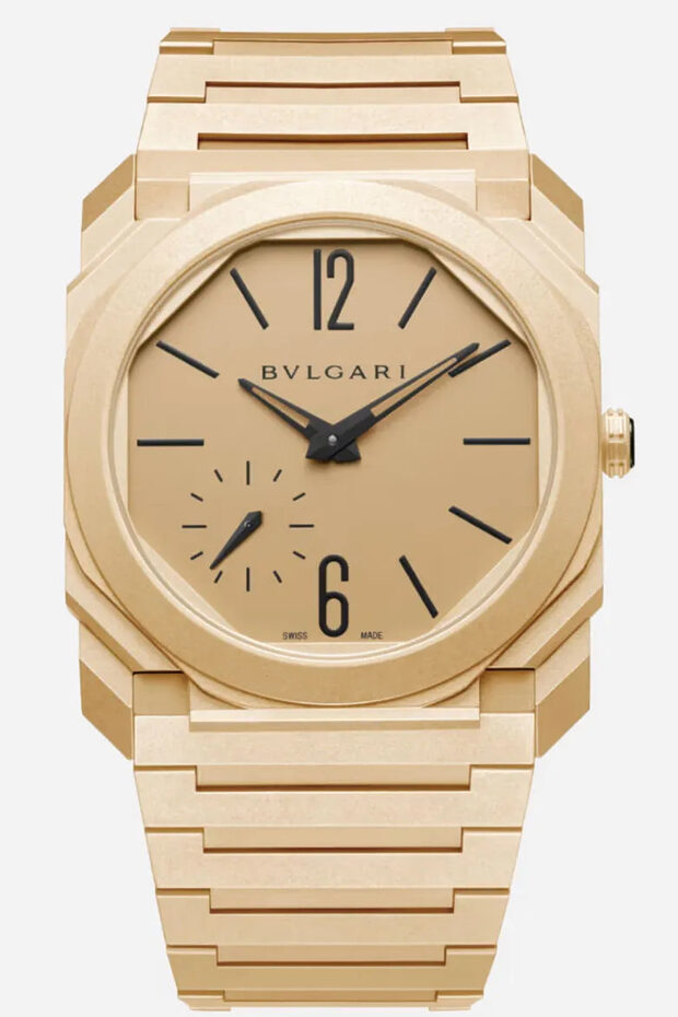 수많은 옥토 피니씨모 중에서도, 샌드블라스트 처리된 18캐럿 옐로 골드 오토매틱 모델은 가장 드레시하면서도 가장 쿨한 선택이다.