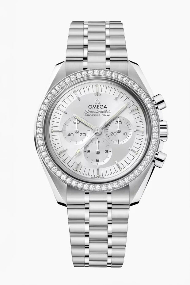 스틸 문워치처럼 보일 수 있지만, 말론 웨이언스의 반짝이는 스피디는 오메가의 특별한 화이트 골드 합금인 카노푸스 골드다.