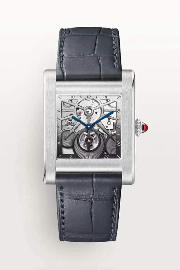 엘로디의 탱크 노르말은 전혀 평범하지 않다. 스켈레톤 다이얼과 다이아몬드 세팅 플래티넘 케이스로, 1차 세계대전 시기의 디자인을 완전히 새로운 정교함의 수준으로 끌어올렸다.