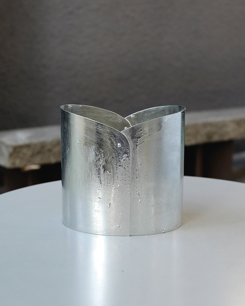 붓결이 살아 있는 주석 마감이 주는 깊이감 덕분에 어떤 공간에 두어도 단숨에 시선을 끈다. 집에서 평범한 와인을 마실 때도 이 버킷에 담아두면 순간의 분위기가 한층 고급스러워진다. 특히 버킷으로만 사용하지 않고 일상에서는 화병으로도 사용하곤 하는데, 술을 즐기지 않는 분들도 오브제 겸 화병으로 사용하기에 매력적인 아이템이다. 김현성 작가 와인 쿨러 31만원, 챕터원.