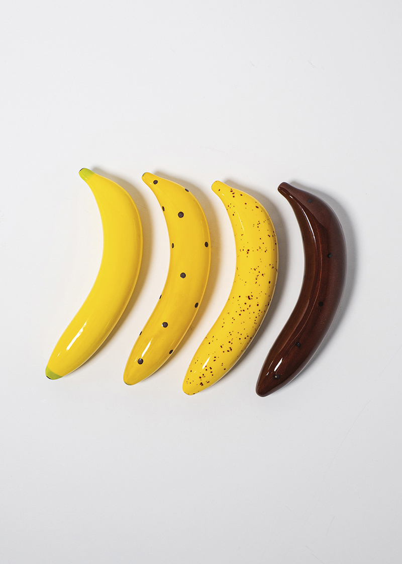 시간의 흐름을 붙잡아둔 듯한 조형물. 집 안에 노란색을 두면 행운이 깃든다는 상징성과, 작은 작품을 10만~20만원대에 소장할 수 있다는 기쁨까지 더해져 선물하기도 좋은 오브제다. 유약의 번짐과 미세한 결이 한 겹 더 깊이를 만들고, 특유의 밝은 색감이 공간에 은근한 활기를 더한다. 크기는 작아도 시선에 오래 남는 존재감이 있다. 박세현 작가의 오브제 ‘내 방 안에 바나나’ 16만~20만원, 챕터원.