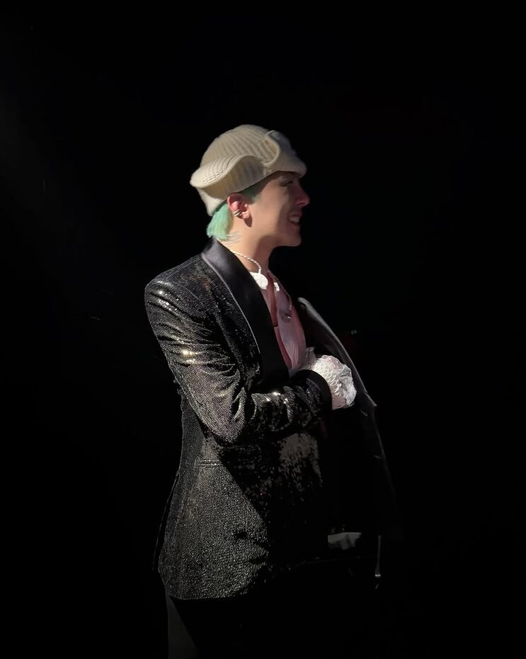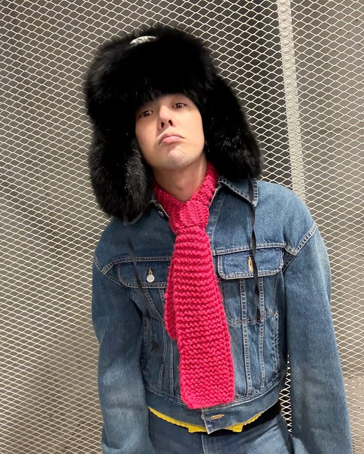 우찬은 퍼 트루퍼 햇을 퍼 재킷과 매치해 과감한 겨울 룩을 완성했다. 자칫 화려해 보일 수 있는 모자일수록 이너는 블랙 톤의 심플한 아이템으로 정리하는 것이 포인트. 퍼의 질감만으로 충분히 힘이 실리면서, 추위 걱정 없는 룩이 완성된다.