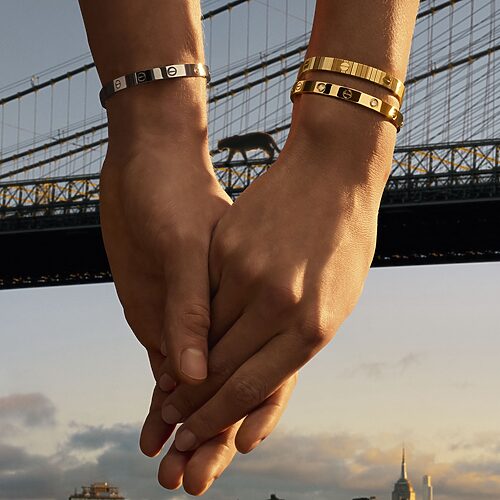 위부터 | 다이아몬드 장식의 핑크 골드 클래식 저스트 앵 끌루 네크리스, 다이아몬드 세팅에 에메랄드, 오닉스를 더한 화이트 골드 스몰 팬더 드 까르띠에 링, 다이아몬드를 파베 세팅한 화이트 골드 미디엄 LOVE 브레이슬릿, 핑크 골드 클래식 저스트 앵 끌루 브레이슬릿, 모두 까르띠에. 재킷, 송지오.