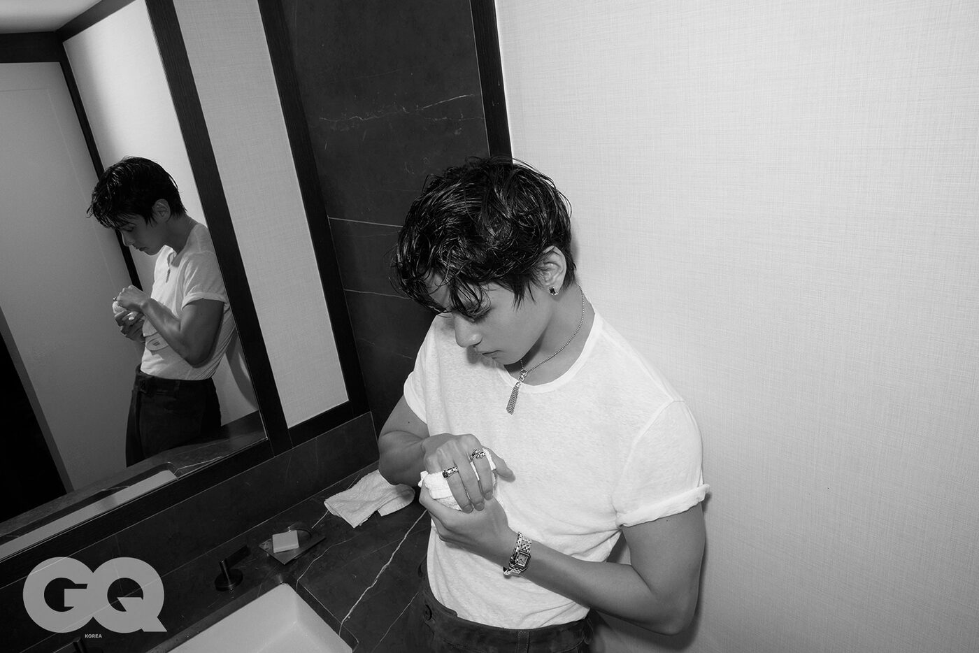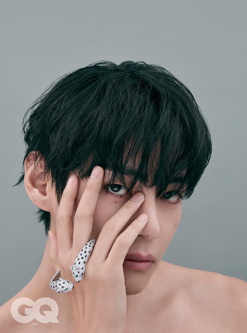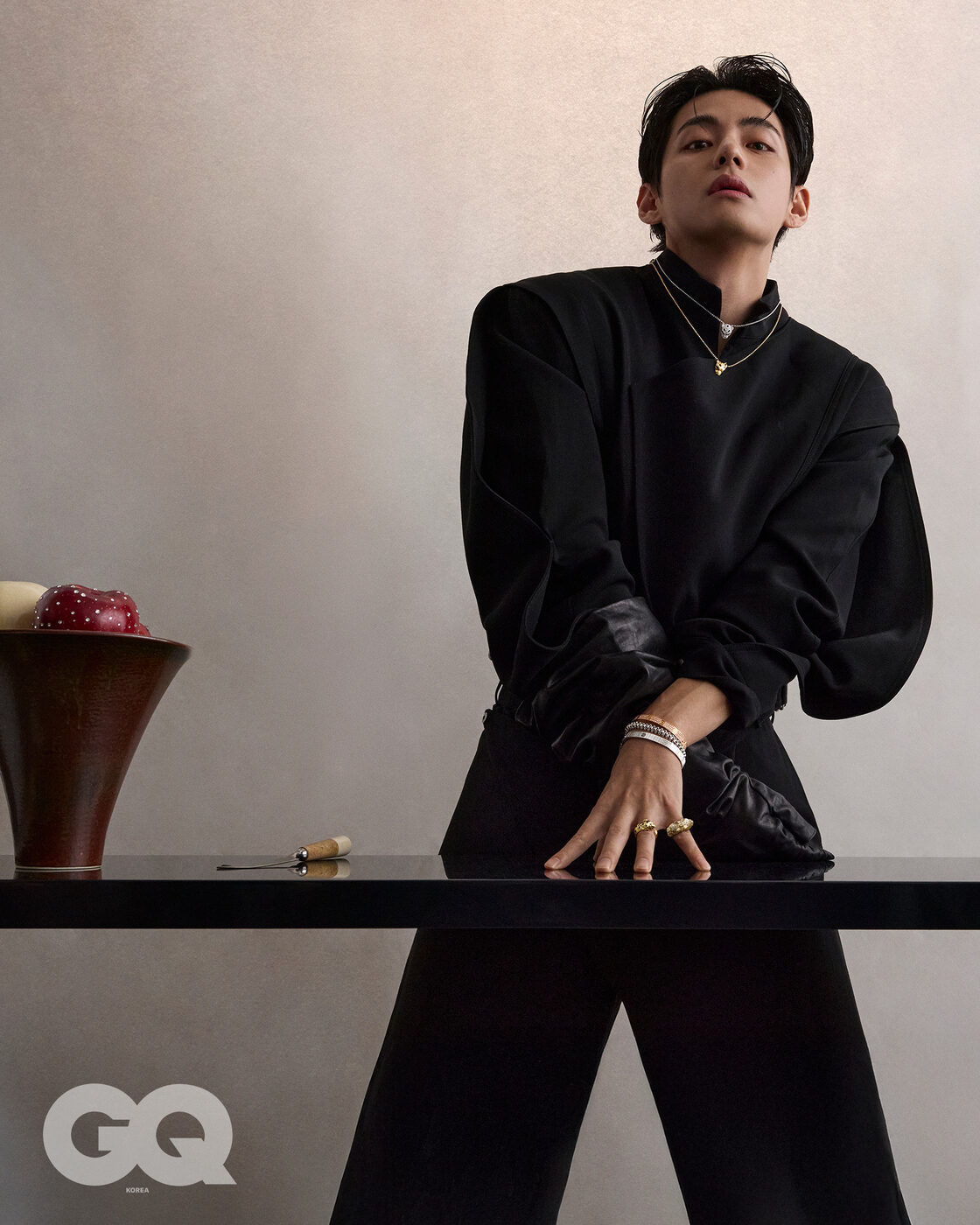 GQ ‘V답다’는 건 결국 어떤 거라고 생각해요? V 음, 그런데 이건 아직 잘 모르겠어요. ‘V답다’는 건 저보다 지켜봐주시는 분들이 더 잘 아시지 않을까 싶어요. GQ V가 생각하는 아름다움의 기준은 어떤 모습이에요? V 전 아무래도 클래식하고 빈티지한 아름다움을 좋아하는 것 같아요. 늘 추구해왔고, 자주 표현하기도 했어요. 이제는 확고한 취향이자 일부가 된 것 같을 정도로요. 하지만 이를 고집하진 않아요. ‘아름답다’고 이야기할 수 있는 다양한 가치에 대해 늘 관심이 많거든요. GQ 오늘 촬영하며 착용한 주얼리와 시계처럼, 아름다워 자주 들여다보게 되는 존재에 대해 물으면 V는 어떤 대상이 떠오를까요? V 우리 아미분들요. 늘 궁금하고, 늘 보고 싶은 존재죠. 아미 외에 다른 대상은 생각나지 않네요. GQ 어떤 아름다움처럼 시간이 지나도 잃지 않고, 변치 않았으면 하는 건요? V 잃고 싶지 않은 건 우리 멤버들. 변치 않았으면 하는 건 아미와 우리의 관계요.