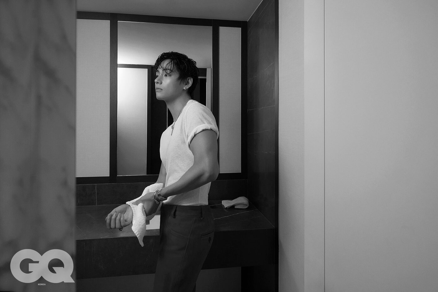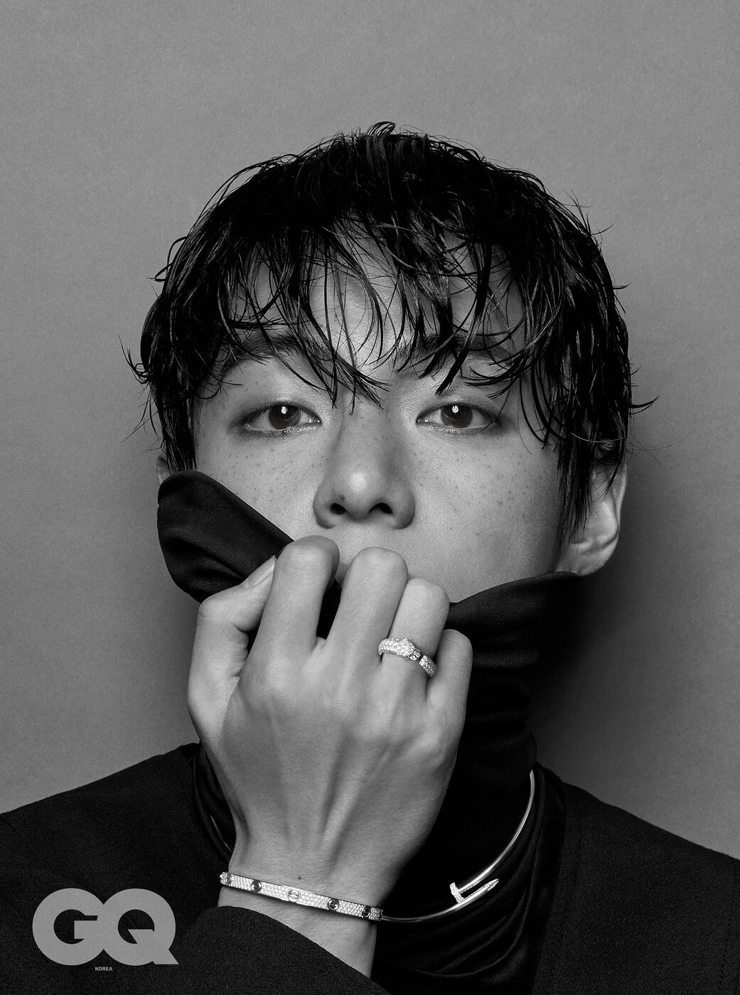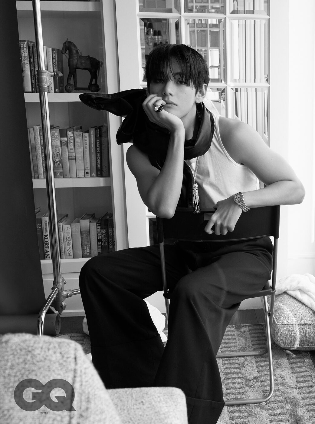 GQ ‘V답다’는 건 결국 어떤 거라고 생각해요? V 음, 그런데 이건 아직 잘 모르겠어요. ‘V답다’는 건 저보다 지켜봐주시는 분들이 더 잘 아시지 않을까 싶어요. GQ V가 생각하는 아름다움의 기준은 어떤 모습이에요? V 전 아무래도 클래식하고 빈티지한 아름다움을 좋아하는 것 같아요. 늘 추구해왔고, 자주 표현하기도 했어요. 이제는 확고한 취향이자 일부가 된 것 같을 정도로요. 하지만 이를 고집하진 않아요. ‘아름답다’고 이야기할 수 있는 다양한 가치에 대해 늘 관심이 많거든요. GQ 오늘 촬영하며 착용한 주얼리와 시계처럼, 아름다워 자주 들여다보게 되는 존재에 대해 물으면 V는 어떤 대상이 떠오를까요? V 우리 아미분들요. 늘 궁금하고, 늘 보고 싶은 존재죠. 아미 외에 다른 대상은 생각나지 않네요. GQ 어떤 아름다움처럼 시간이 지나도 잃지 않고, 변치 않았으면 하는 건요? V 잃고 싶지 않은 건 우리 멤버들. 변치 않았으면 하는 건 아미와 우리의 관계요.