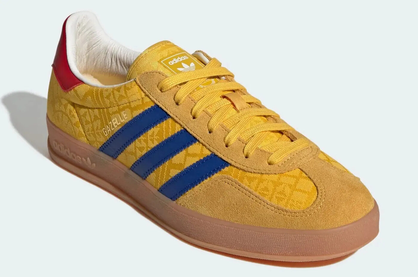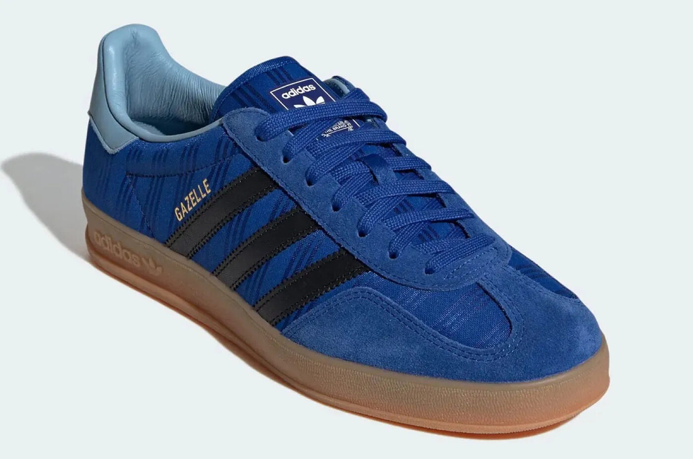 아르헨티나 가젤 인도어는 컬리지에이트 로열 컬러의 캔버스를 바탕으로 수직 스트라이프가 더해졌다. 이는 1998년 아르헨티나 대표팀 유니폼을 떠올리게 하는 명확한 오마주다. 안감에는 베이비 블루 컬러가 들어가 있으며, 뒤꿈치에는 국기의 태양 문양을 연상시키는 금빛 포일 마감의 아디다스 로고가 자리 잡고 있다.