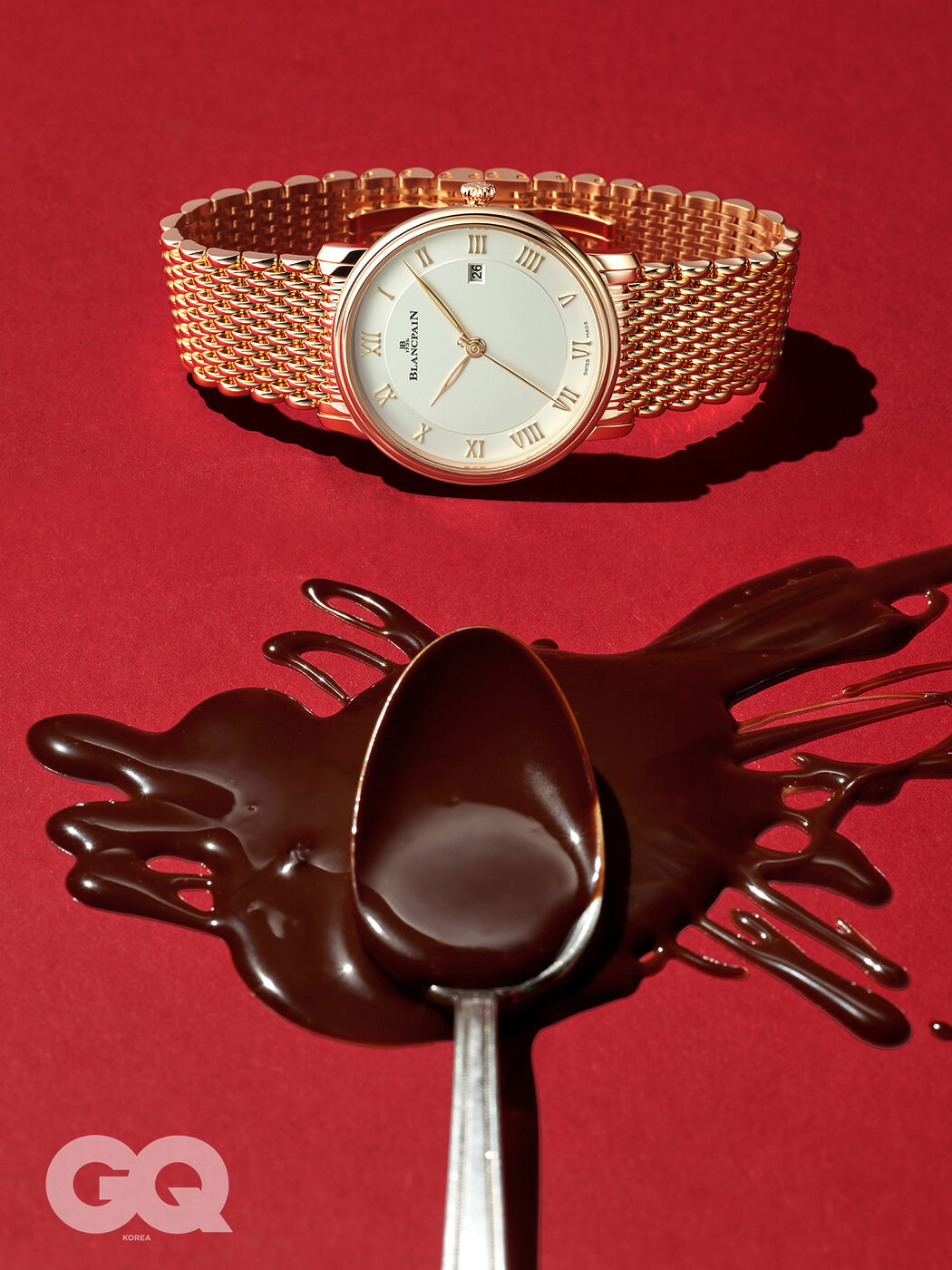 불필요한 장식을 덜어내어 은은한 오팔 빛 다이얼 이외의 모든 요소를 레드 골드 소재로 완성했다. 다이얼 위에는 고전적인 로마 숫자 인덱스와 간결한 나뭇잎 모양 핸즈를 올렸고, 쫀쫀한 짜임의 절제된 브레이슬릿을 매치해 드레스 워치로도 손색없다. 빌레레 울트라 슬림 6천5백86만원, 블랑팡.