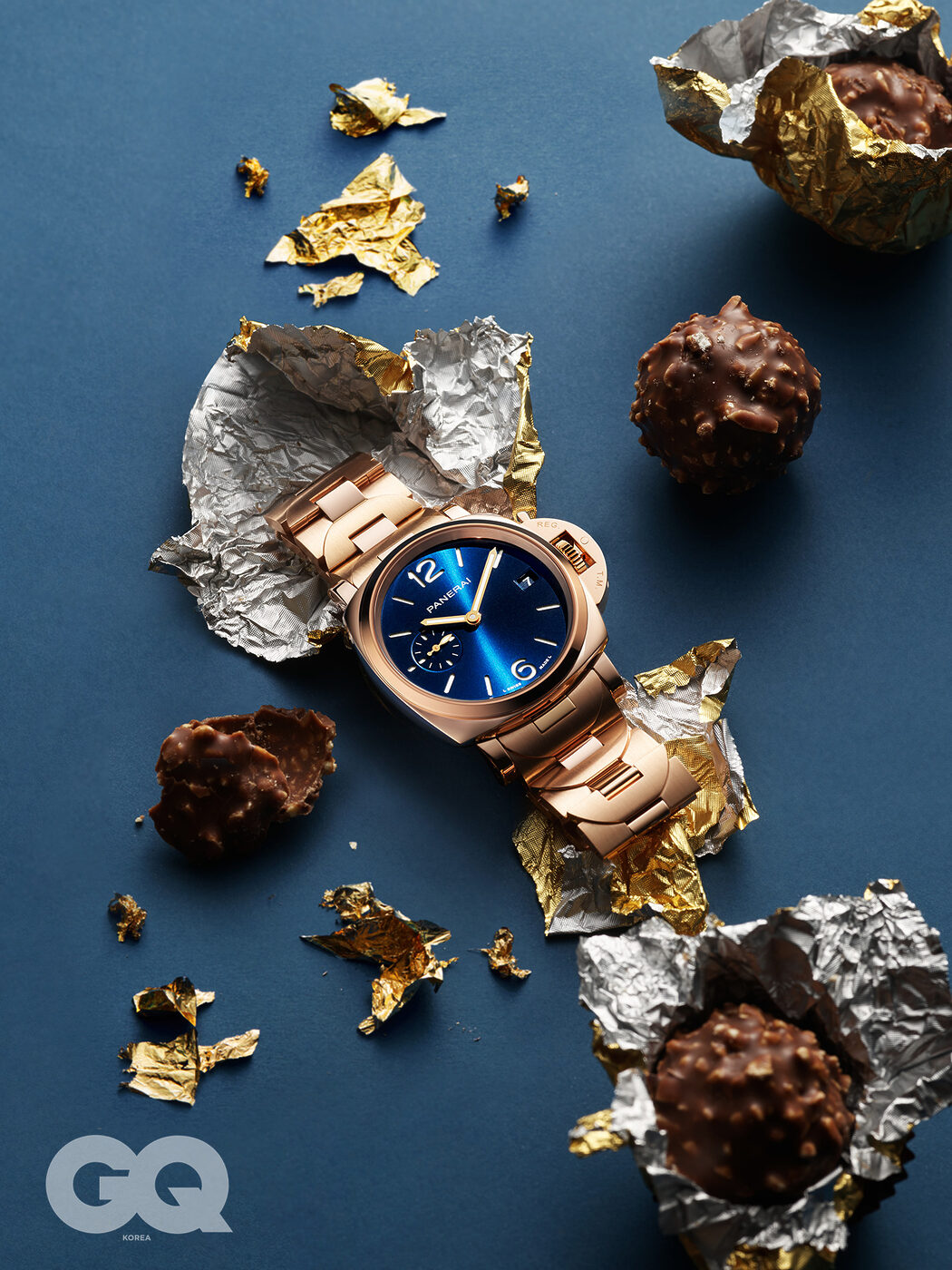 루미노르 컬렉션 고유의 쿠션형 케이스와 샌드위치 다이얼, 크라운 가드는 유지한 채 얇고 가늘게 실루엣을 다듬어 낯설고도 새로운 인상을 준다. 파네라이의 독자적인 18K 레드 골드 소재인 골드테크™를 사용해 시간이 흘러도 은은한 붉은빛 광채를 띤다. 루미노르 두에 뚜또오로 5천5백90만원, 파네라이.