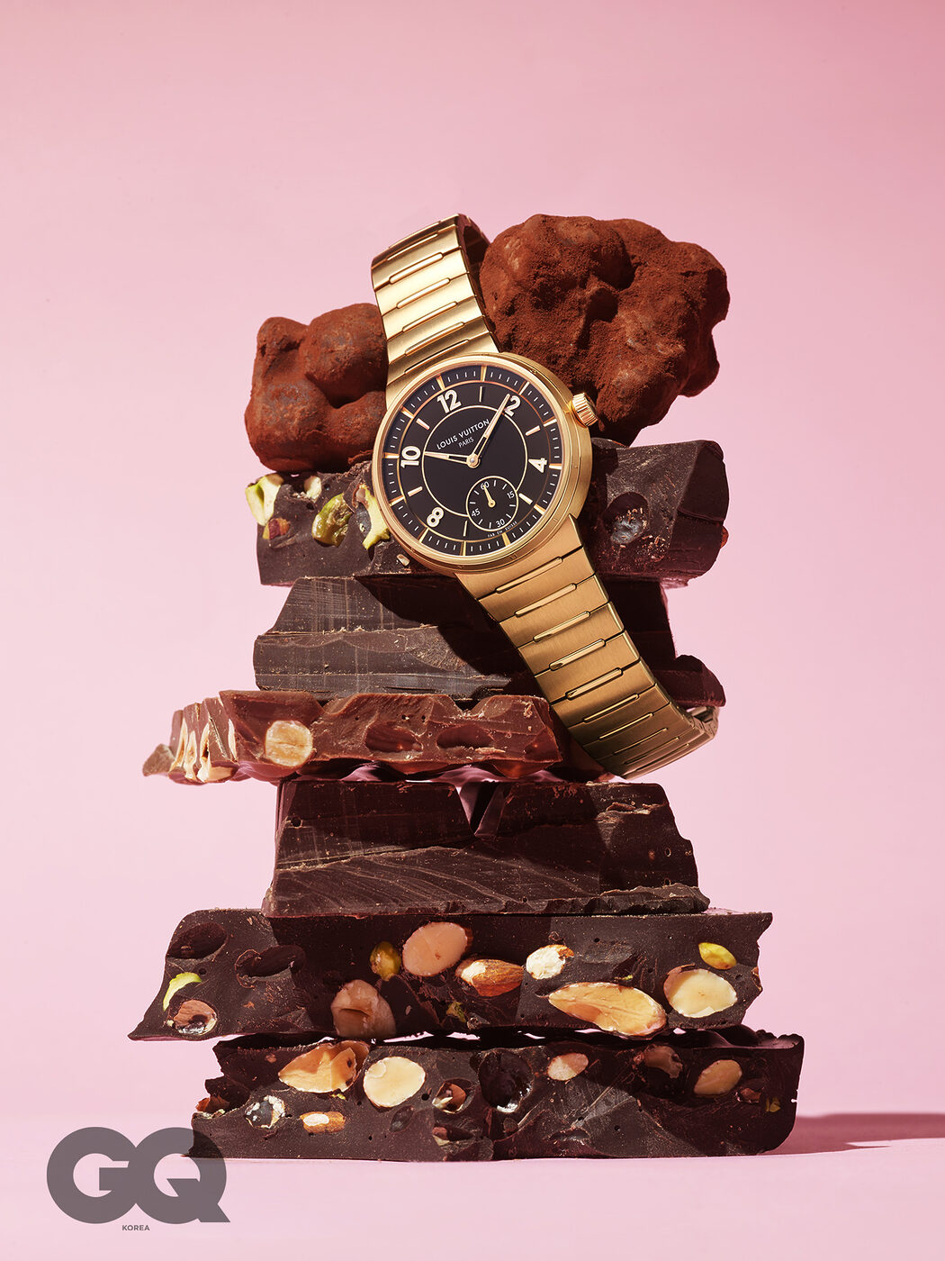 은은한 핑크 골드 북 모양 케이스와 벨벳처럼 그윽한 다크 초콜릿 컬러 다이얼이 조화를 이룬다. 러그를 생략하고 케이스와 브레이슬릿을 하나로 이어 착용감이 유연하다. 인하우스 무브먼트 LFT023 칼리버를 탑재했고, 6시 방향에는 둥근 아몬드 모양의 스몰 세컨즈를 얹었다. 뉴 땅부르 40밀리미터 가격 미정, 루이 비통.
