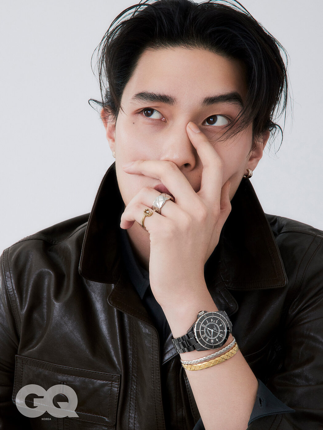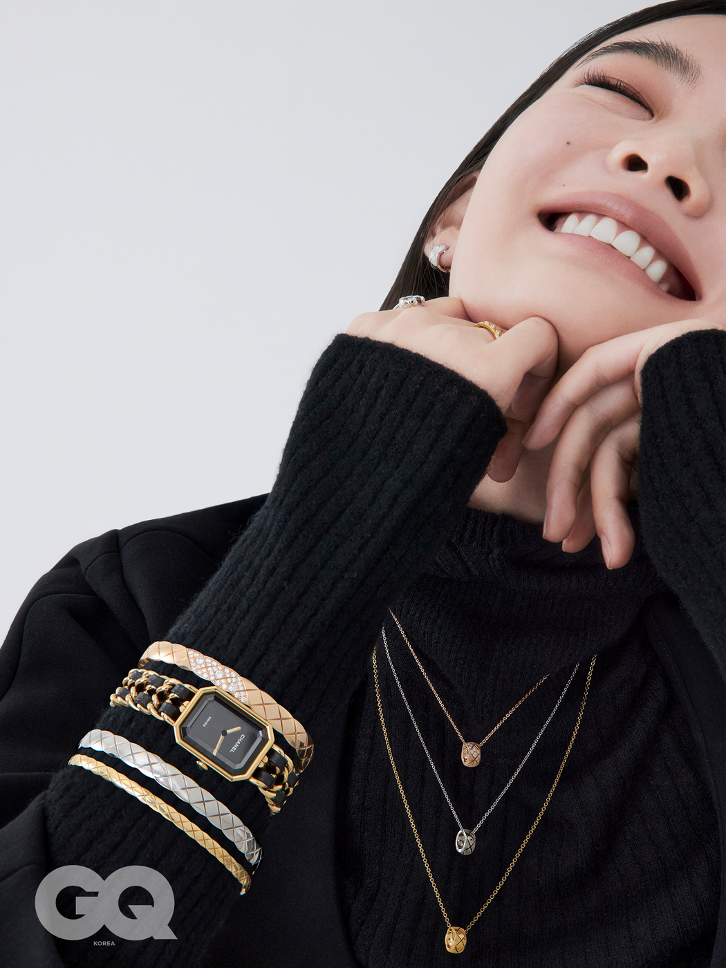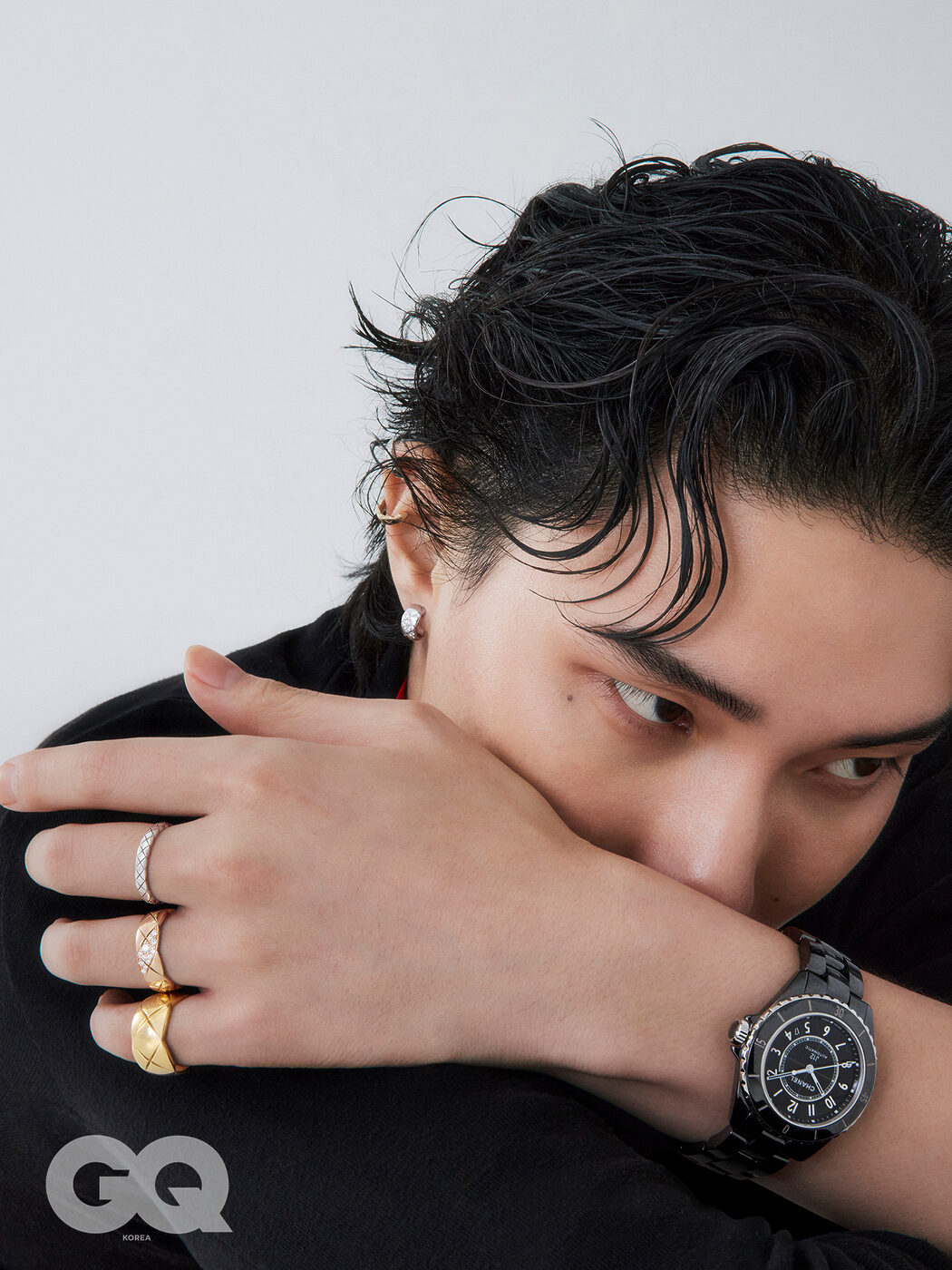 18K 베이지 골드에 다이아몬드를 세팅한 2026 코코 크러쉬 이어링, 18K 화이트 골드 코코 크러쉬 라지 링, 18K 베이지 골드에 다이아몬드로 포인트를 준 2026 코코 크러쉬 링, 퀼팅 모티프를 정교하게 각인한 18K 화 이트 골드 코코 크러쉬 미니 브레이슬릿과 18K 옐로 골드 코코 크러쉬 브레이슬릿 가격 미정, 모두 샤넬 파인 주얼리. 블랙 래커 다이얼에 블랙 세라믹 케이스와 브레이슬릿을 매치해 세련된 디자인으 로 완성한 J12 워치 칼리버 12.1 38MM 블랙 가격 미정, 샤넬 워치.