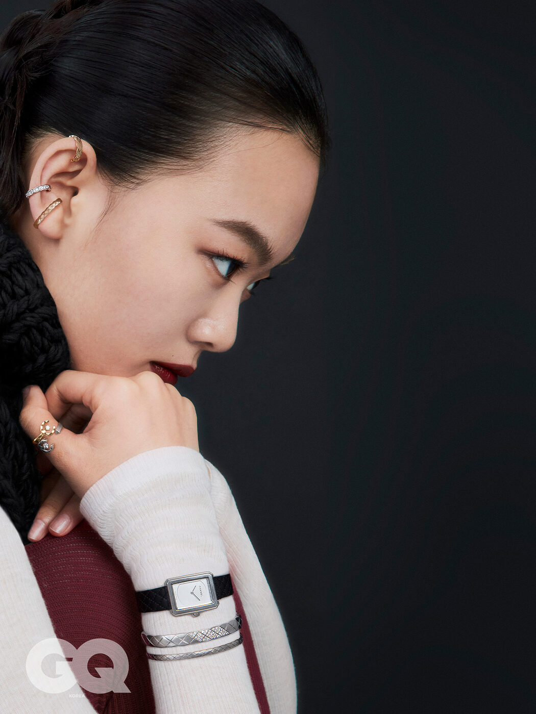 18K 베이지 골드 싱글 이어링, 다이아몬드를 세팅한 18K 화이트 골드 후프와 18K 베이지 골드 후프가 하나의 쌍을 이루는 2026 코코 크러쉬 싱글 이어링, C 모티프 중앙에 다이아몬드를 악센 트 세팅한 18K 옐로 골드와 18K 화이트 골드 2026 코코 크러쉬 링, 18K 화이트 골드에 다이아몬드로 마무리한 코코 크러쉬 브레이슬릿, 18K 화이트 골드 코코 크러쉬 미니 브레이슬릿 가격 미정, 모 두 샤넬 파인 주얼리. 사각 스틸 케이스와 블랙 스트랩이 모던한 인상을 풍기는 보이·프렌드 스몰 워치 가격 미정, 샤넬 워치.