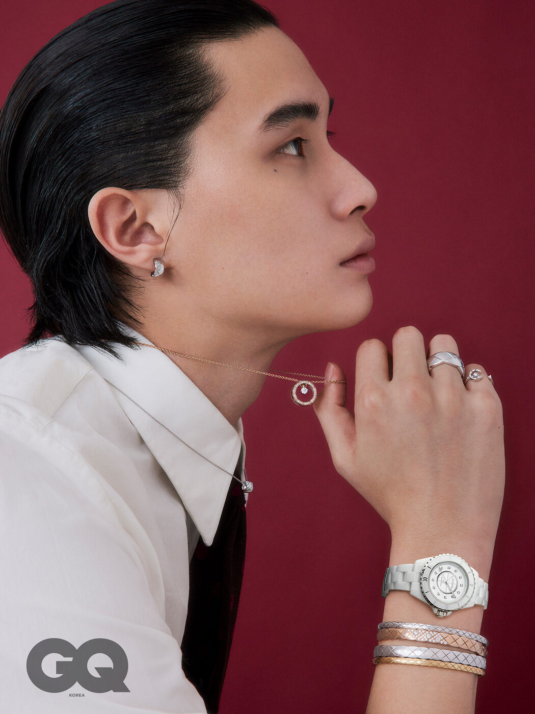 18K 화이트 골드 2026 코코 크러쉬 이어링, 18K 베이지 골드와 다이아몬드로 완성한 퀼팅 모티프 코코 크러쉬 네크리스, 18K 화이트 골드에 다이아몬드를 세팅한 2026 코코 크러쉬 네크리 스, 18K 화이트 골드 코코 크러쉬 라지 링, 18K 화이트 골드에 다이아몬드로 포인트를 더한 2026 코코 크러쉬 링, 18K 화이트 골드 코코 크러쉬 미니 브레이슬릿, 18K 베이지 골드에 다이아몬드를 적 용한 코코 크러쉬 브레이슬릿, 18K 화이트 골드로 이루어진 코코 크러쉬 브레이슬릿, 18K 옐로 골드 코코 크러쉬 미니 브레이슬릿 가격 미정, 모두 샤넬 파인 주얼리. 브릴리언트컷 다이아몬드를 다이 얼 인덱스에 세팅한 J12 워치 칼리버 12.2 33MM 화이트 가격 미정, 샤넬 워치.