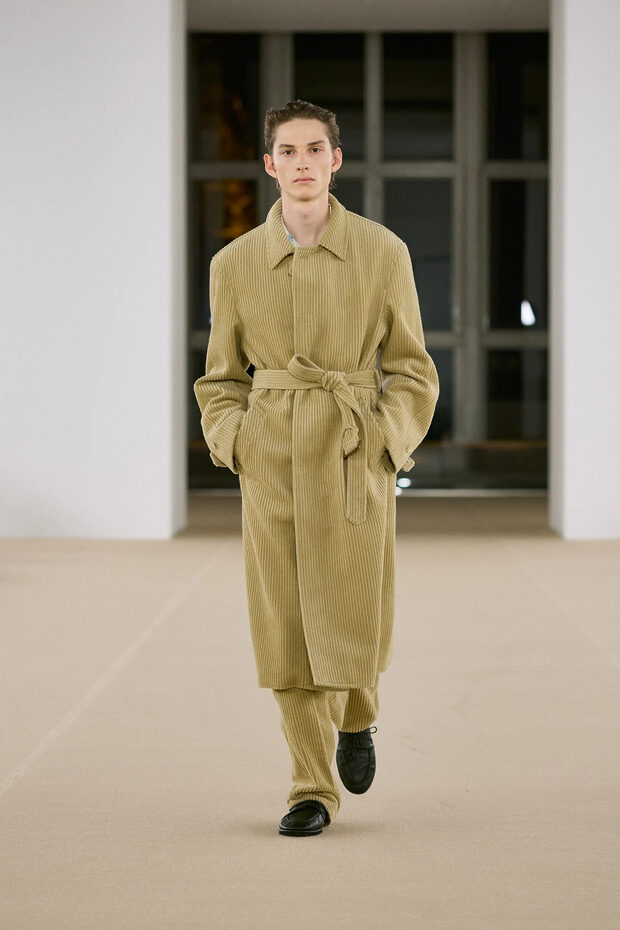 내가 보기에 그 미래는 레트로 로맨티시즘이라 부를 수 있는 무언가로 형태를 갖추고 있다. 여기서 레트로란 1970년대와 1980년대의 실루엣을 참조한 옷을 뜻한다. 그 시기는 남성복의 황금기로, 옷이 더 자연스럽게 움직이고 감정을 담고 있던 시대였다. 이 영감은 두 쇼 전반에 걸쳐 분명히 드러난다.
