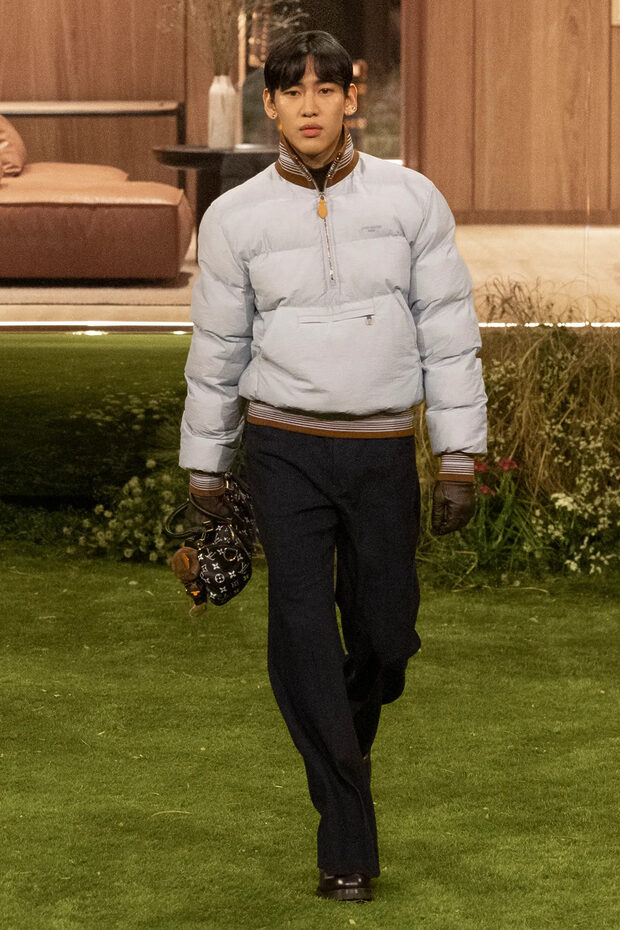 한편, 지난 시즌 인도의 의복 전통에서 직접적인 영감을 받았던 퍼렐은 이번에는 다른 방향으로 여행을 떠난 듯 보였다. 바로 미래다. 그는 어떤 시대에도, 심지어 다음 시대에도 입을 수 있는 타임리스한 옷을 만들라는 과제를 팀에 던졌다. 느긋한 1980년대 실루엣을 기반으로 하되, 기술적으로 한 단계 끌어올린 디테일로 오늘에 맞게 재해석하는 방식이었다. 그 결과는 실크와 나일론 혼방 소재의 대량 사용으로 나타났고, 리버서블 모노그램 백과 정교하게 테일러드된 조거 팬츠에서도 이를 확인할 수 있었다. 여기에 고급 방수와 반사 기능을 갖춘 엔지니어드 패브릭도 더해졌다.