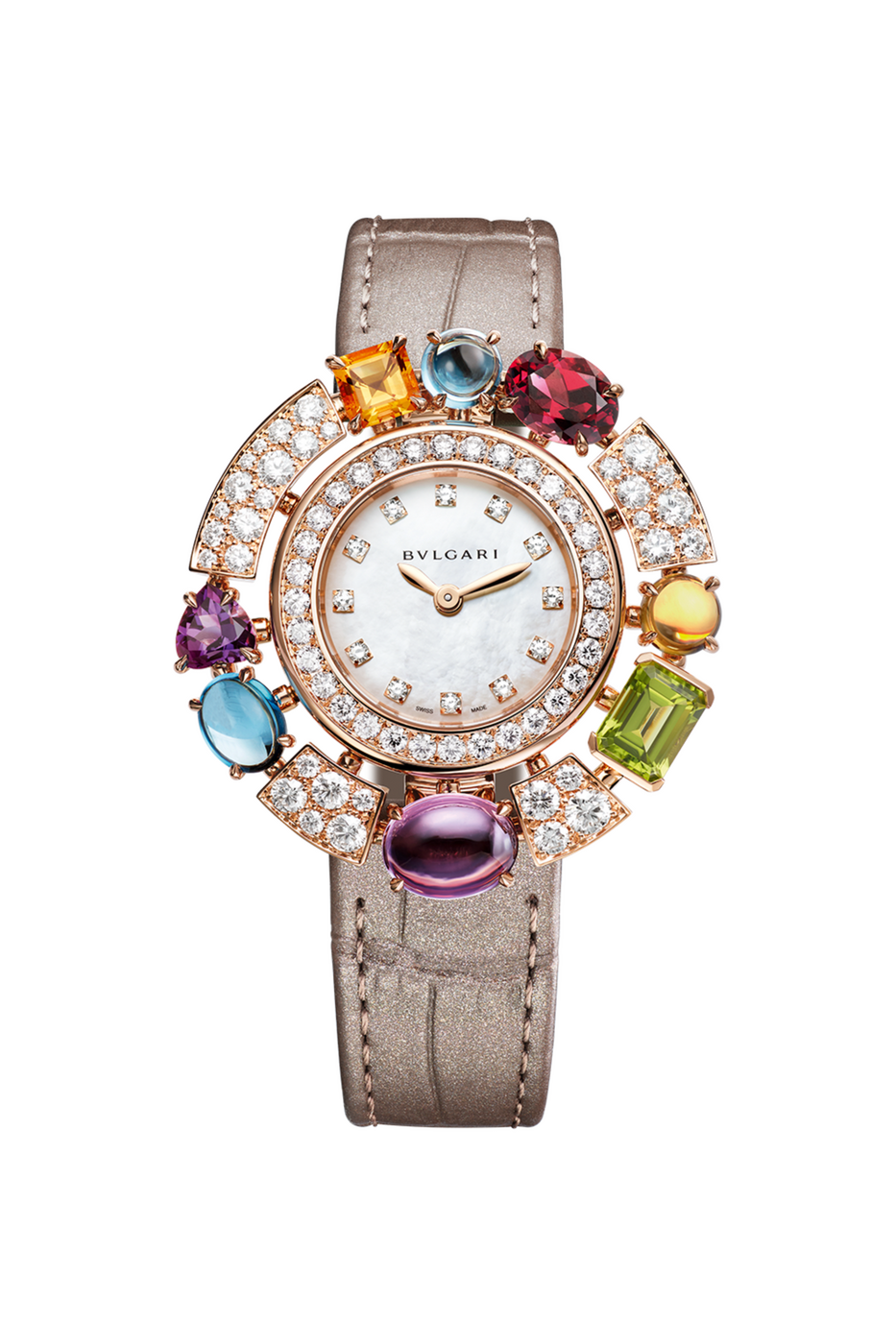 환하다. 화려하다. 활력이 흘러넘친다. 매혹적인 스타일과 불가리의 탁월한 주얼리 기술이 만난 로즈 골드 소재의 알레그라 칵테일 워치다. 다이아몬드, 시트린, 아메시스트, 블루 토파즈, 페리도트, 로돌라이트 등 각면 처리된 젬스톤과 카보숑 스톤을 조합한, 마치 꽃다발을 연상케 하는 디자인이 인상적이다. 다이아몬드가 세팅된 인덱스는 마더 오브 펄 다이얼과 토프 앨리게이터 브레이슬릿과 어우러져 우아하면서도 생동감 넘치는 감각을 불어넣는다. 4,760만 원.