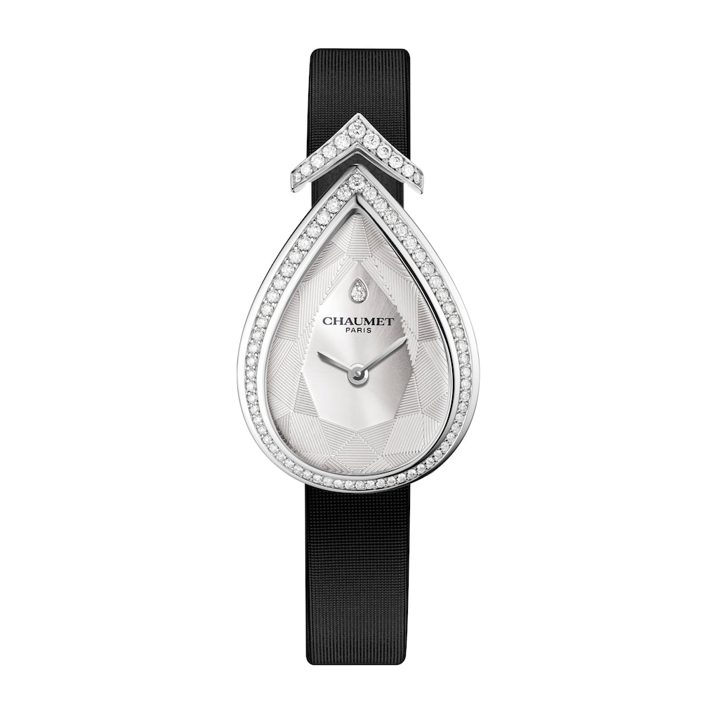다이아몬드가 세팅된 화이트 골드 소재에 인그레이빙 다이얼을 더한 조세핀 아그레뜨는, 조세핀 황후가 사랑한 페어 컷을 재해석한 작품이다. V형 아그레뜨에서 다이얼을 장식한 다이아몬드 트롱프뢰유 인덱스까지, 조세핀 컬렉션의 아이코닉한 유전자가 녹아 있는 모델. 베젤에는 브릴리언트 컷 다이아몬드 62개(0.23캐럿)가 세팅됐고, 다이얼 12시 방향에는 브릴리언트 컷 다이아몬드 1개(0.048캐럿)가 사용됐다. 다양한 사이즈로 제공되는 블랙 새틴 브레이슬릿이 거슬리는 장식 없이 독특한 방식으로 손목을 감싸준다. 가격은 문의.