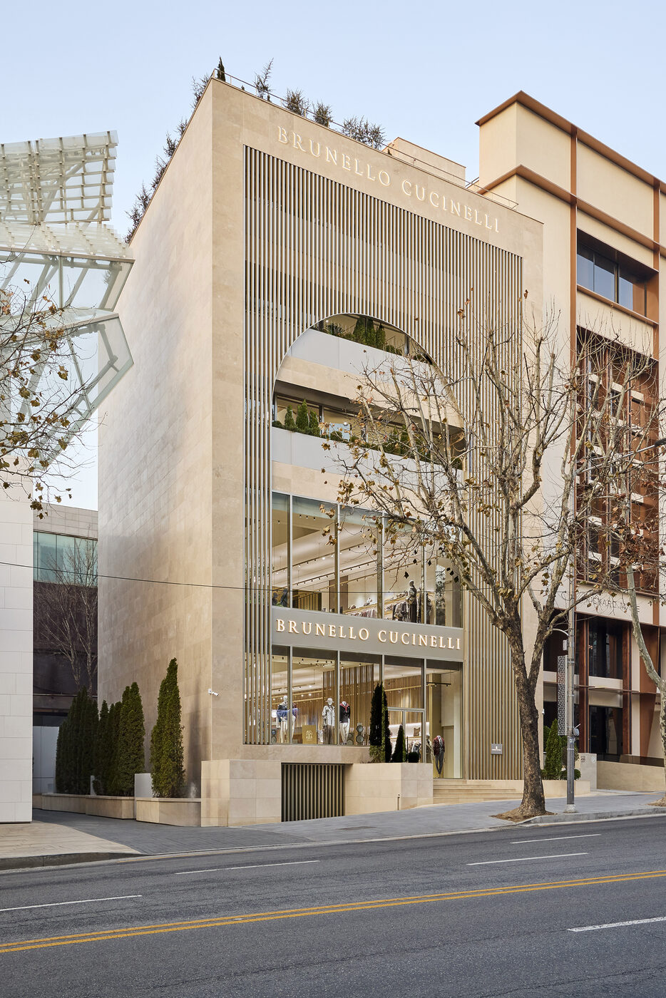 먼저 건축을 기술이 아닌 인간을 위한 인문학이라 설명한 철학자이자 건축가 레온 바티스타 알베르티의 이론에 근거해, 가장 처음 마주하는 입구를 건물의 얼굴이자 손님을 맞이하는 첫인사라고 여겼다. 그런 맥락에서 브루넬로 쿠치넬리 청담 플래그십의 전면부에는 고대부터 유럽의 여러 도시들이 방문객을 맞이하는 관문을 상징하는 웅장한 아치 디자인을 적용했다. 브루넬로 쿠치넬리는 지난 2014년, 2500년의 역사를 지닌 고대의 관문 ‘에트루리아 문’의 복원을 추진한 바 있는데, 이번 청담 플래그십 스토어 파사드 디자인에 이 프로젝트가 영향을 미치기도 했다. 세로로 섬세하게 분절된 파사드의 형태는 자연의 바람과 빛을 활용해 천연 직물과 가죽을 제작하던 이탈리아 중세 시대 수공업 공방의 로지아 목조 지붕 구조에서 착안했다. 외부 곳곳을 장식한 사이프러스 상록수는 로마 시대부터 아이의 탄생을 기념하며 심어온 나무로, 삶과 지속되는 아름다움을 상징한다.