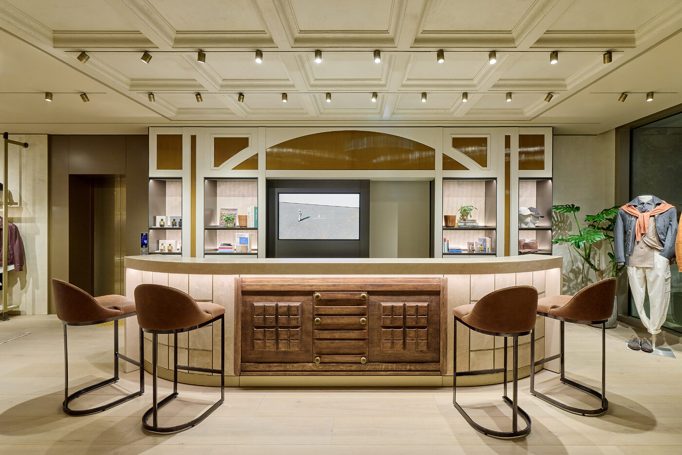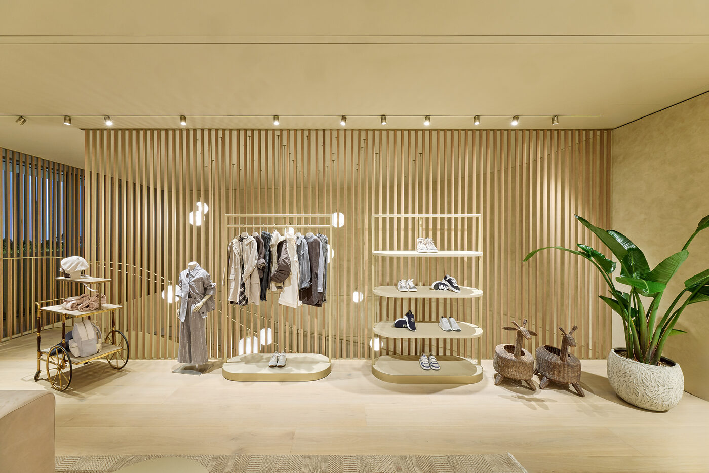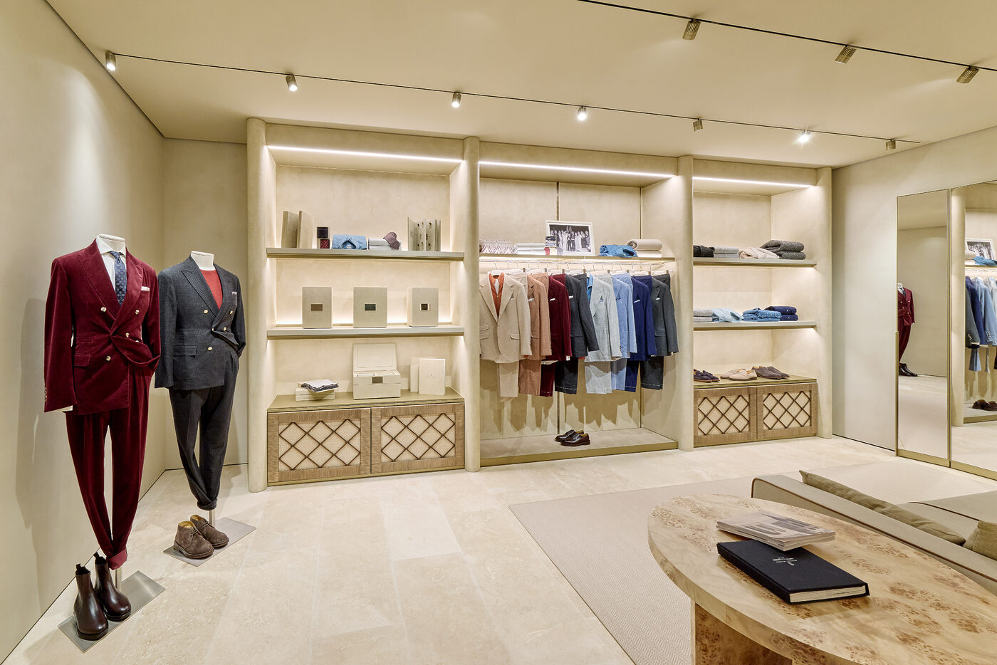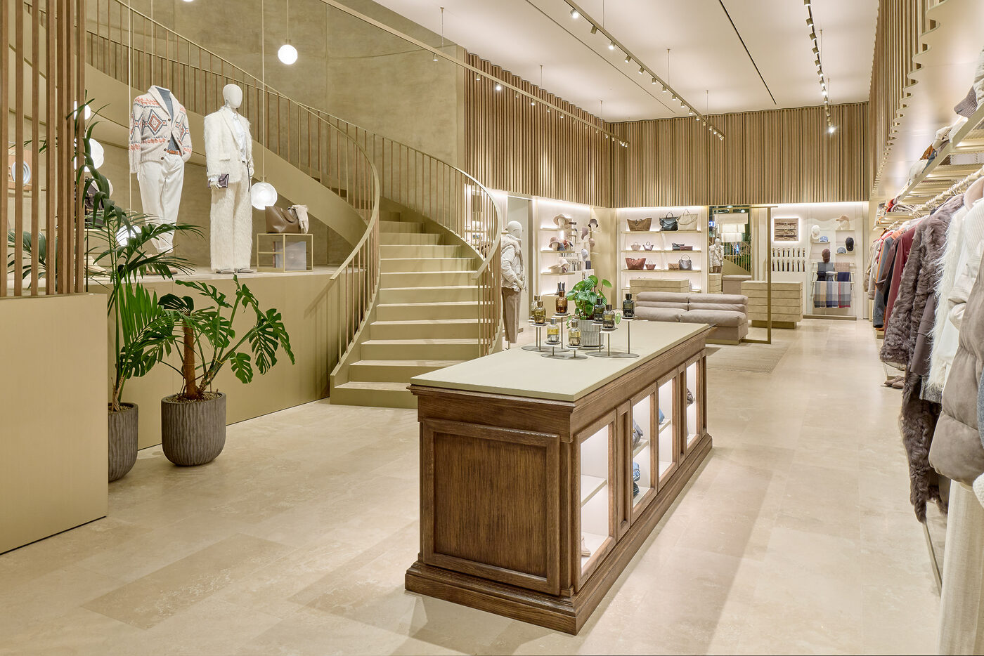 아치형 관문을 지나 매장 내부로 들어서면 이탈리아 솔로메오로 순간 이동하게 된다. 내부 공간은 브루넬로 쿠치넬리의 근간인 솔로메오 특유의 차분하고 포근한 분위기를 고스란히 담아냈다. 테이블과 소파 같은 주요 가구부터 작은 장식 오브제, 은은한 벽면의 색조와 소재에 이르기까지 이탈리아 전역에서 수집한 값진 피스들로 구성, 브랜드 특유의 취향과 미감을 여지없이 드러낸다. 내부는 총 5개 층으로 설계되었다. 1층은 가장 개방적인 공간으로, 시즌을 대표하는 컬렉션과 함께 가방, 슈즈, 스카프, 아이웨어 등 핵심적인 아이템만 선별해 제안한다. 2층은 여성 컬렉션 공간으로 응접실을 연상시키는 단정하고 편안한 분위기로 연출했다. 남성 컬렉션이 자리한 3층은 라운지 형태의 휴식 공간을 더해 품격 있는 아지트 같은 장소로 완성했다. 4층에선 그간 국내에서 만나기 어려웠던 아동 컬렉션과 함께 테이블웨어, 쿠션, 담요, 오브제 등 풍요로운 라이프스타일 아이템을 선보인다. 5층은 VIP를 위한 전용 라운지로 외부와 차단된 프라이빗한 방식으로 운영된다. 그리고 청담동 거리가 시원하게 내려다보이는 6층의 루프톱까지, 이 반듯한 건물 안엔 브루넬로 쿠치넬리의 인본주의적 철학과 삶의 낭만이 견고하게 담겨있다.