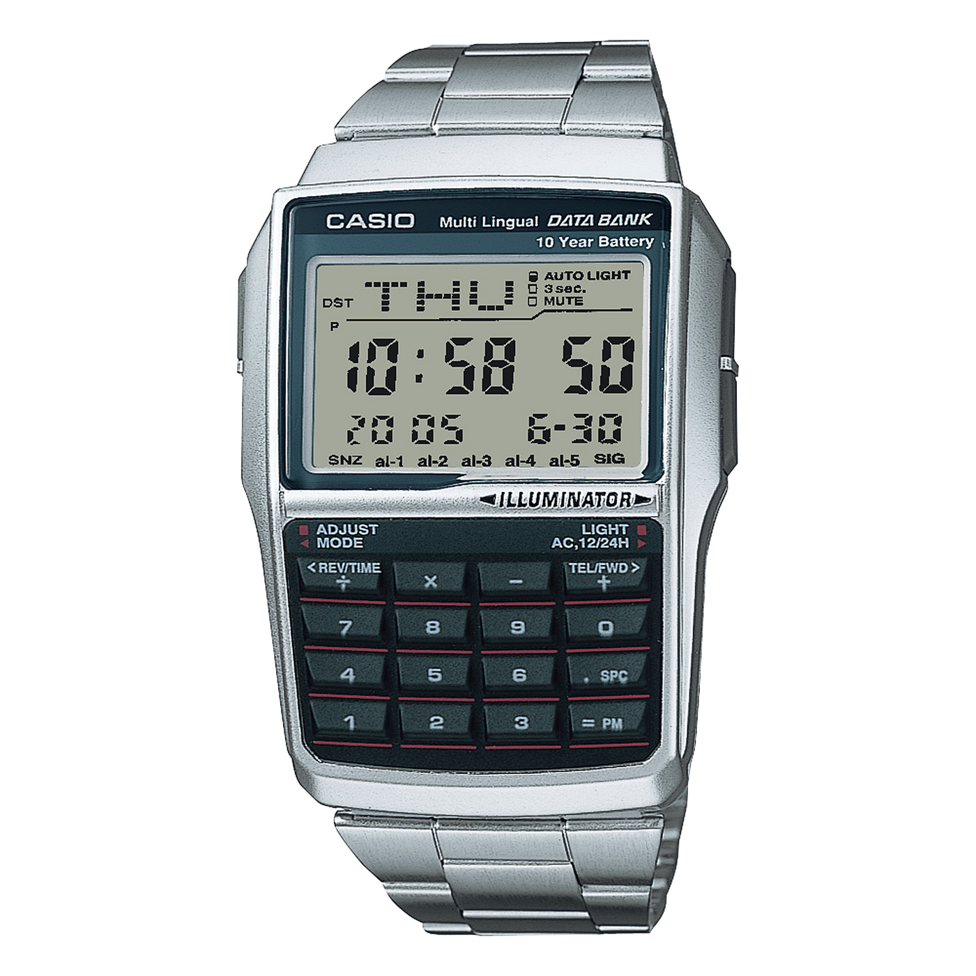 다국어 데이터뱅크 디지털시계에 10개의 키가 포함된 키패드 계산기가 결합한 모델. 8자리까지 계산 가능. 대형 고대비 LCD를 통해 가독성을 높였다. 최대 25개 항목을 저장할 수 있는 메모리 데이터뱅크는 13개 언어로 문자를 입력할 수 있다. 그 밖에도 10년의 배터리 수명, 통화 변환, 5개의 다기능 알람, 듀얼 타임 등 기능이 탑재됐다.