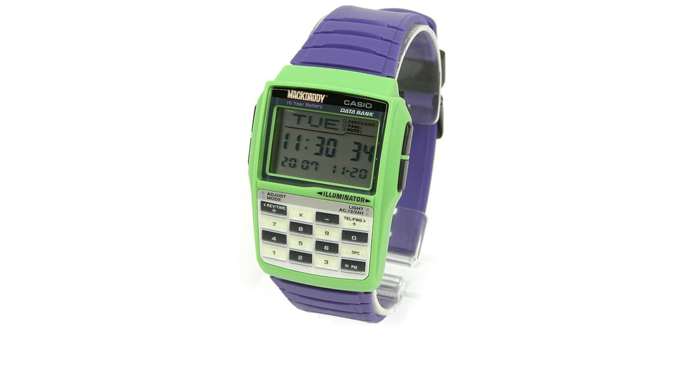 한 시대를 풍미했던 일본의 스트리트 브랜드 맥대디가 2007년 당시 창립 10주년을 기념하며 카시오와 콜라보 워치를 내놓은 적도 있다. DBC-32CM을 베이스로 제작한 이 모델은, 보라색 스트랩과 초록색 페이스의 강렬하면서 생동감 넘치는 대비가 포인트다. 체스판을 연상케 하는 계산기 버튼도 인상적. 케이스 백에는 ‘10th ANNIVERSARY’ 문구를 새겼다.