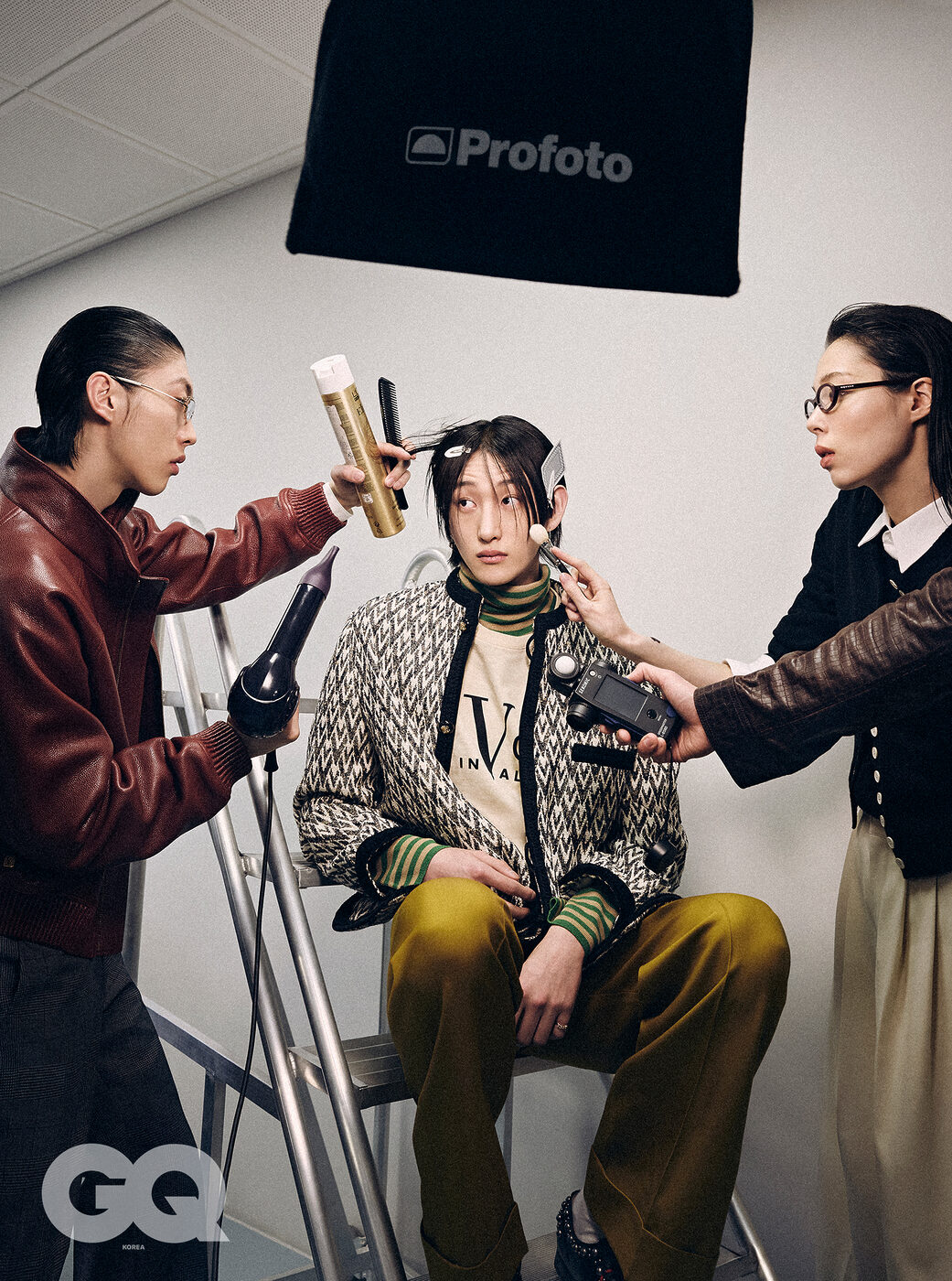 왼쪽부터 | 버건디 레더 재킷과 그레이 팬츠, 모두 루이 비통. 사각 프레임 안경, 젠틀 몬스터. 자카드 부클레 재킷, 코튼 티셔츠, 스트라이프 크루넥 니트와 옐로 팬츠, 모두 발렌티노. 로퍼, 발렌티노 가라바니. 블랙 카디건, 화이트 셔츠, 아이보리 몬탁 크롭트 팬츠, 모두 셀린느. 라운드 안경, 맥퀸. 브라운 레더 재킷, 아미리.
