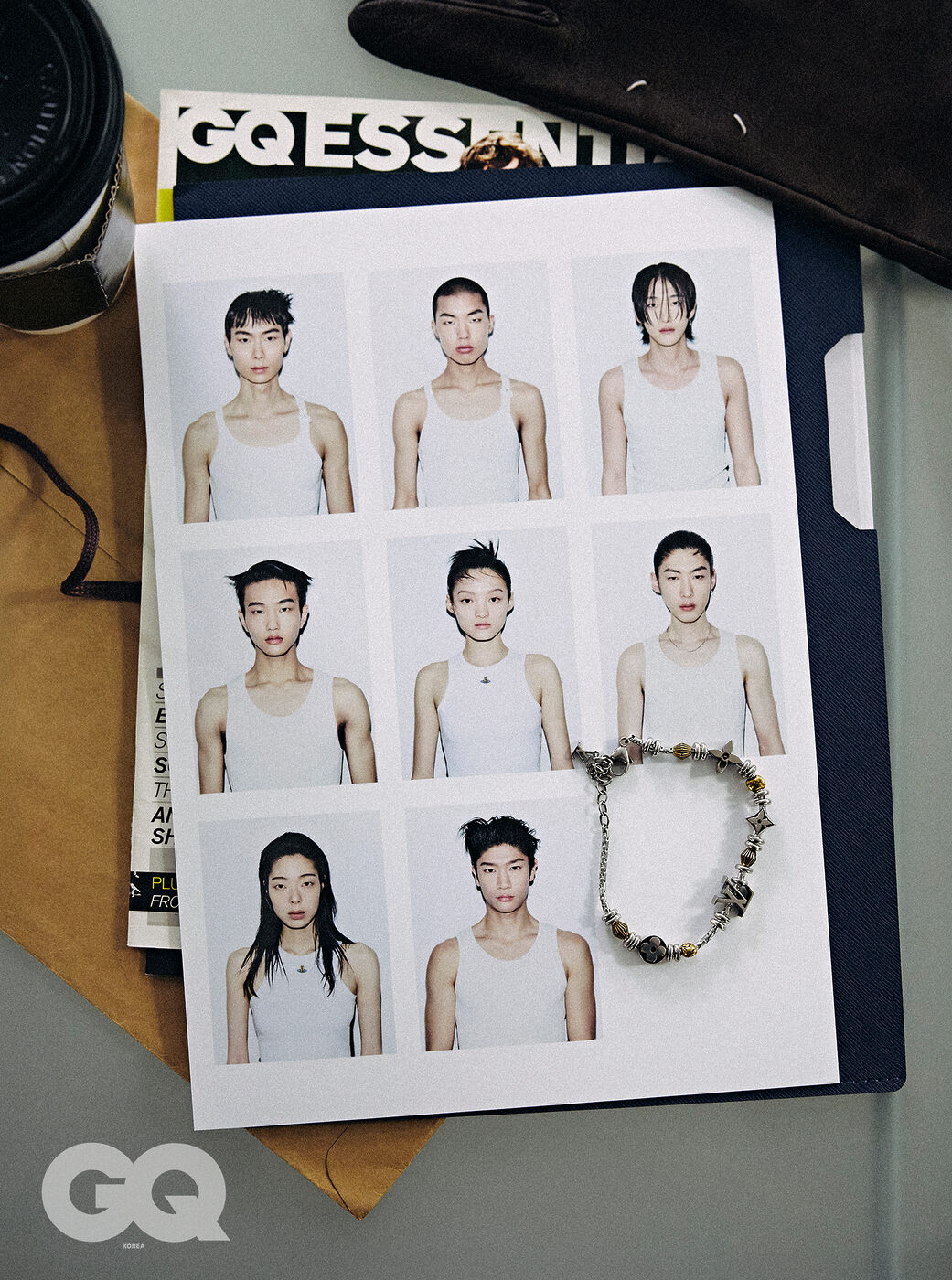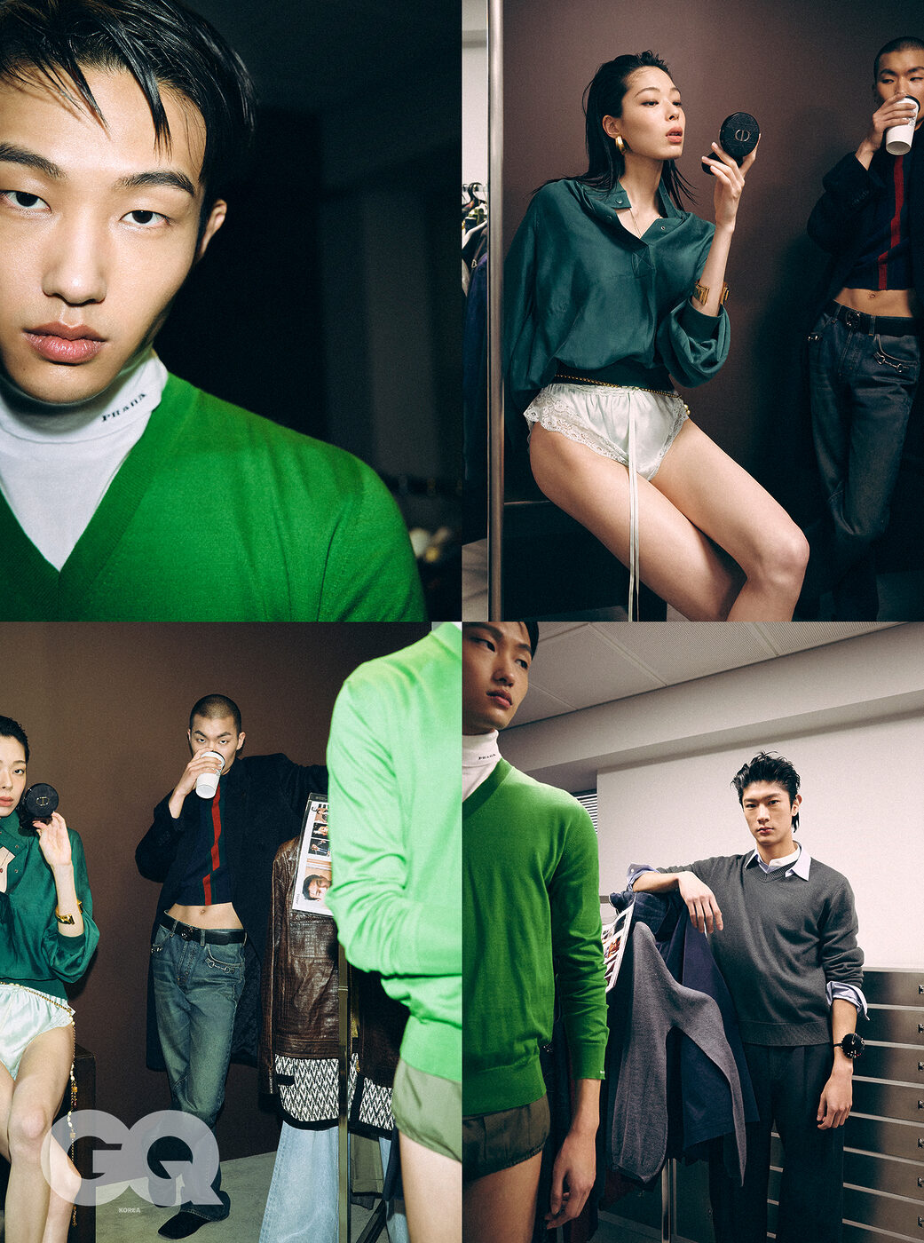 왼쪽 위부터 | 그린 브이넥 니트와 화이트 터틀넥 톱, 카키 포플린 브리프, 모두 프라다. 그린 실크 톱, 실크 플리츠 란제리 쇼츠, 골드 이어링, 스트로베리 네크리스, 스크롤 커프, 펄 체인 벨트, 모두 생 로랑 by 안토니 바카렐로. 네이비 코트와 니트, 데님 팬츠, 블랙 로퍼, 블랙 벨트, 모두 구찌. 그레이 니트, 블루 셔츠, 다크 그레이 팬츠, 모두 더로우.