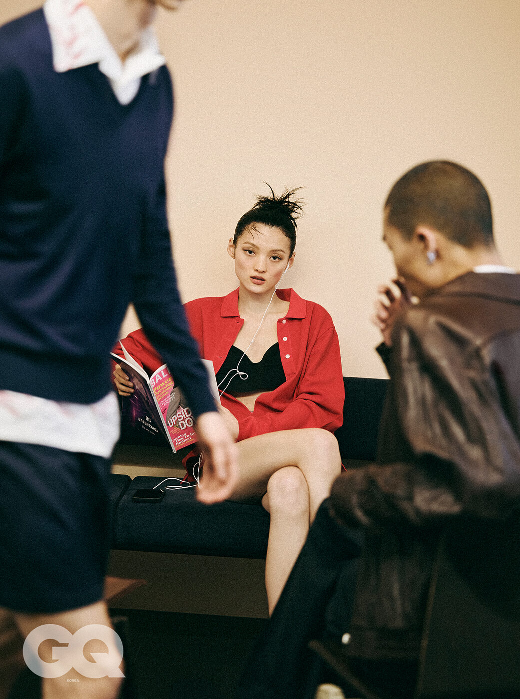 네이비 브이넥 니트와 쇼츠, 화이트 셔츠, 모두 프라다. 레드 폴로 롱 슬리브, 블랙 브라 톱, 라벤더 포플린 브리프, 모두 프라다. 브라운 하이넥 레더 재킷, 렉토. 화이트 셔츠, 셀린느. 블랙 팬츠, YCH.