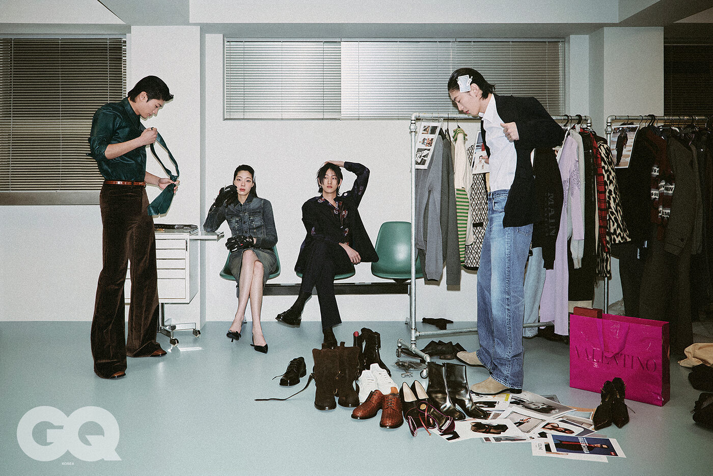 왼쪽부터 | 블랙 재킷과 롱 스커트, 모두 발렌시아가. 올리브 마스틸레토 힐, 아미리. 네이비 브이넥 니트와 쇼츠, 화이트 셔츠, 모두 프라다. 블랙 시퀸 슬리브리스와 팬츠, 모두 구찌. 스트라이프 셔츠와 쇼츠, 팬츠, 레드 타이, 더비 슈즈, 모두 생 로랑 by 안토니 바카렐로. 블랙 트렌치코트, 퍼플 브이넥 니트, 코팅 데님 팬츠, 스웨이드 부츠, 브라운 크로셰 스카프, 레더 체인 벨트, 모두 버버리. 테이블에 놓인 레더 몸바사 백, 생 로랑 by 안토니 바카렐로. 행거에 걸린 블랙 르 시티 모토 백, 발렌시아가.