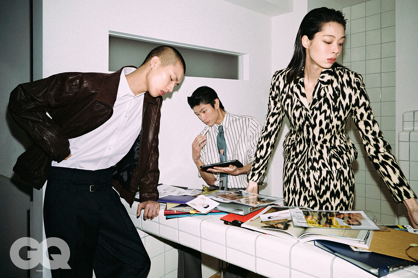 브라운 하이넥 레더 재킷, 렉토. 화이트 셔츠, 셀린느. 벨트 디테일 블랙 팬츠, YCH. 스트라이프 셔츠와 그레이 팬츠, 패턴 타이, 모두 돌체앤가바나. 레오퍼드 퍼 쇼트 코트와 스커트, 모두 렉토.