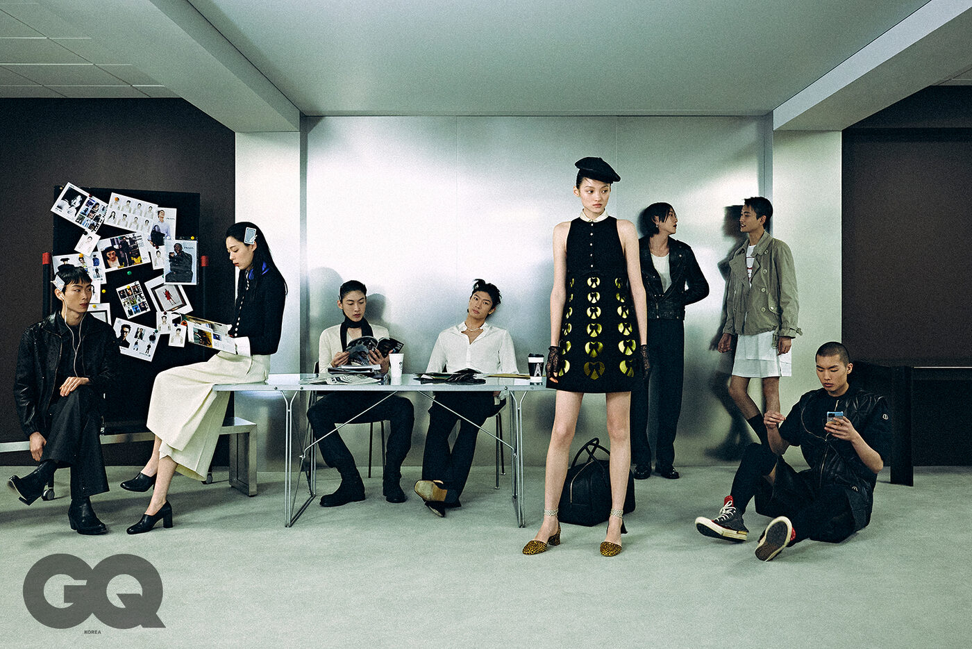 왼쪽부터 | 블랙 레더 재킷과 셔츠, 팬츠, 타이, 앵클부츠, 모두 어네스트 W. 베이커 at 10 꼬로소 꼬모 서울. 블랙 카디건, 화이트 셔츠, 아이보리 몬탁 크롭트 팬츠, 블루 실크 스카프, 모두 셀린느. 블랙 펌프스 힐, 르메르. 화이트 브이넥 니트, 코팅 데님 팬츠, 스웨이드 부츠, 실크 자카드 스카프, 모두 버버리. 화이트 셔츠와 블랙 팬츠, 블랙 로퍼, 모두 구찌. 실버 네크리스, 펜디. 리본 포인트 드레스, 발렌티노. 레오퍼드 본디 펌프스 힐, 레더 베레모, 글러브, 모두 발렌티노 가라바니. 블랙 레더 더플백, 생 로랑 by 안토니 바카렐로. 레더 바이커 재킷, 골든구스. 슬리브리스 톱, 렉토. 블랙 팬츠와 슈즈, 모두 아미. 베이지 파나마 재킷, 화이트 티셔츠, 슬리브리스 톱, 블랙 삭스, 블랙 로퍼, 모두 프라다. 블랙 다운 베스트와 블랙 티셔츠, 블랙 니삭스, 모두 몽클레르 + 릭 오웬스. 레더 쇼츠, YCH. 카키 스니커즈, 메종 마르지엘라.