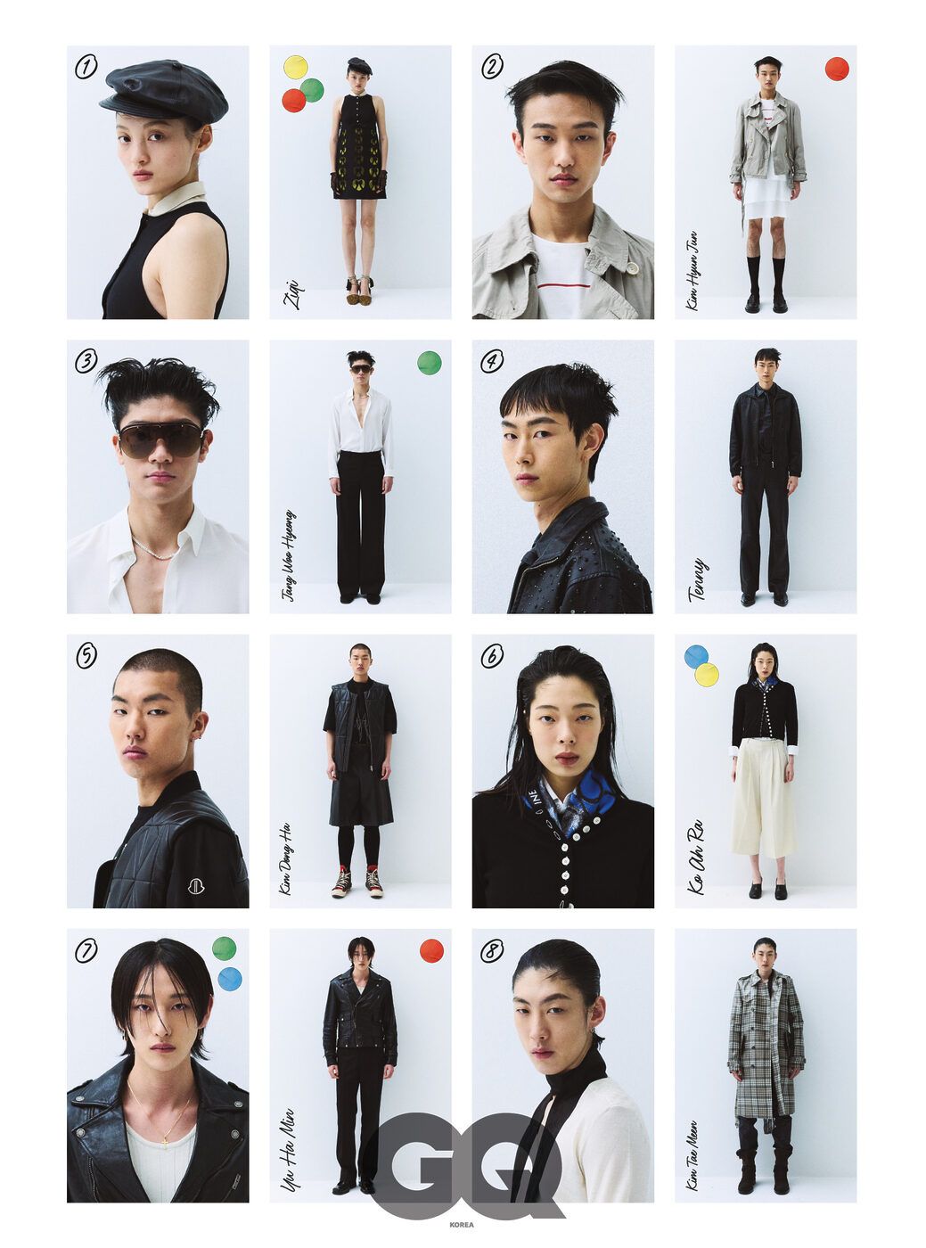 왼쪽부터 | 카우하이드 레더 재킷, 올세인츠. 블랙 슬리브리스, 아미. 데님 팬츠, 셀린느. 타비 앵클부츠, 메종 마르지엘라. 그레이 베스트와 레드 팬츠, 모두 아크네 스튜디오. 모커스 로퍼, 발렌티노 가라바니. 블루 틴티드 선글라스, 톰 포드. 브라운 레더 재킷, 디젤. 데님 팬츠, 아크네 스튜디오. 블랙 더비, 아미. 데님 맨 재킷과 팬츠, 블루 맨 셔츠, 스트라이프 맨 타이, 모두 디올. 브라운 스니커즈, 루이 비통. 네이비 셔츠와 데님 팬츠, 블랙 더비 슈즈, 블랙 캡, 모두 발렌시아가. 화이트 셔츠와 그레이 팬츠, 모두 루이 비통. 블랙 로퍼, 프라다. 블랙 레더 타이, 어네스트 W. 베이커 at 10 꼬로소 꼬모 서울. 워치 셰이프 브레이슬릿, 발렌시아가. 브라운 레더 재킷과 폴로 셔츠, 크루넥 니트, 그레이 플레어 팬츠, 브라운 레더 부츠, 화이트 벨트, 모두 아미리. 림리스 안경, 레이밴 by 에실로룩소티카. 블랙 레더 트렌치 코트와 블랙 셔츠, 블랙 펌프스 힐, 모두 르메르. 에라 T7 안경, 젠틀 몬스터.
