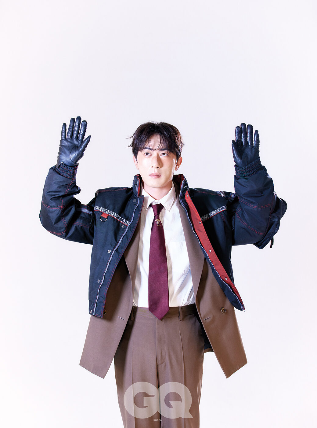 MA1 점퍼, 마틴로즈 by 아데쿠베, 싱글 브레스트 재킷, MM6 by 아데쿠베. 타이, 제이프레스. 장갑은 스타일리스트의 것.