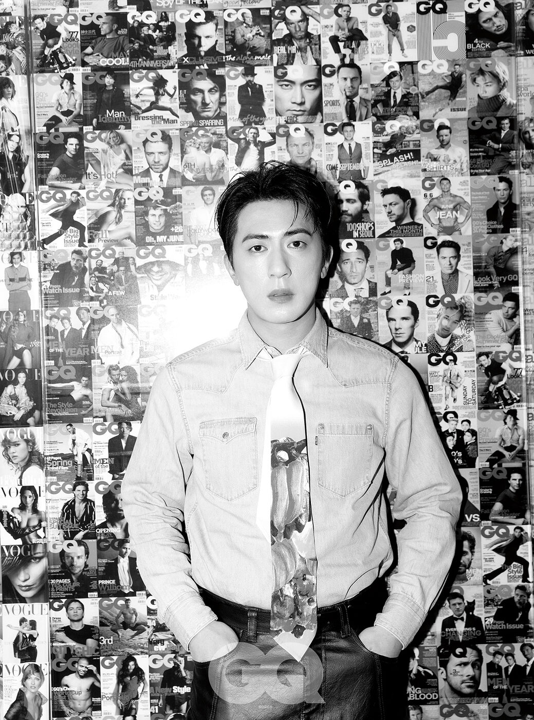 데님 셔츠, 리바이스. 타이, 비앙카 손더스. 레더 팬츠, 벨트는 모두 스타일리스트의 것.