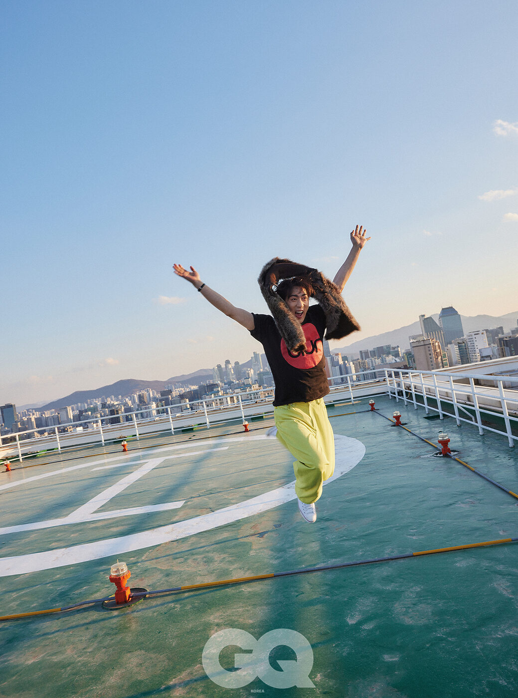 옐로 데님 팬츠, 오니츠카 타이거. 퍼 머플러, 오웬 베리. 스니커즈, 컨버스. 티셔츠, 팔찌는 모두 스타일리스트의 것.