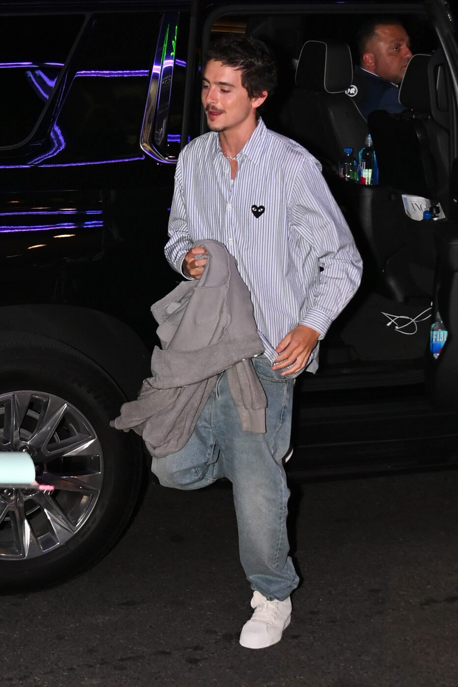 눈 달린 작은 하트 엠블럼은 10년 전만 해도 피할 수 없는 상징이었지만, 요즘은 보기 드문 장면이다. 샬라메는 이를 라이트 워시 진과 새것처럼 깨끗한 화이트 스니커즈에 매치했다. 이 역시 2010년대 후반 트렌드 무덤에서 되살아난 듯한 스타일이다.