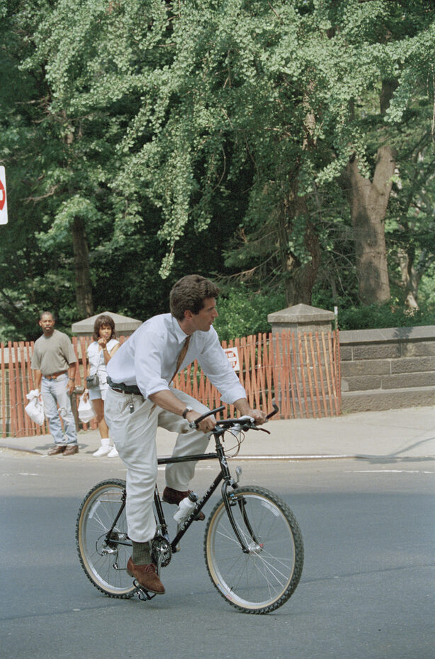 이 사진이 촬영된 지 30년이 지났는데도 무드보드에 끊임없이 등장하는 데에는 이유가 있다. 뒤로 멋스럽게 젖힌 캡과 목에 단단히 맨 타이의 하이-로우 대비, 그러니까 장르를 충돌시키는 존 F. 케네디 주니어의 진면목이다. 2026년을 사는 우리에게 주는 실질적인 교훈은 무엇일까? 지하철로 출퇴근하더라도, 9 to 5 수트를 조금은 비틀어도 좋다는 것. 완벽한 더블 브레스티드 수트에 쿠반 힐 부츠를 매치해 격식을 무너뜨린 그의 모습이 좋은 예다. 또는 잘 다려진 셔츠까지 차려 입은 정장 차림에 다리를 걷어 올리고 쿨하게 자전거를 타는 모습이라던지. 물론 한쪽 바지를 걷은 것은 자전거 체인에 딸려들어가지 않도록 한 것이다.