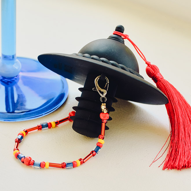 국립중앙박물관 광복 80주년 기념 특별전 《우리들의 이순신》을 기념한 뮷즈. 디자인 브랜드 프라이스(frice)와 협업했다. 국립중앙박물관의 소장품인 ‘수군조련도 병풍’ 속 삼도 수군이 착용한 ‘전립’을 모티브로 제작된 와인 마개는 내경 2cm 이하의 다양한 유리병에 사용이 가능하다.