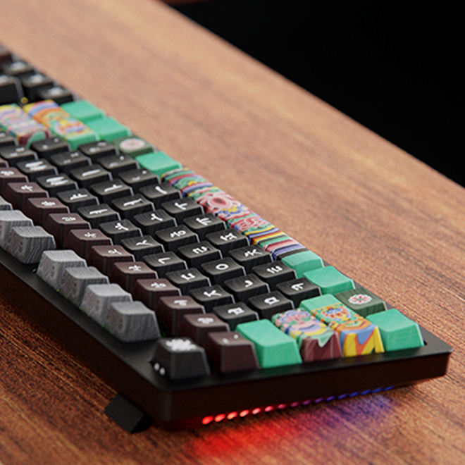 품절 대란을 불러일으킨 단청 키보드. 한국 궁궐의 지붕 기와, 벽돌 패턴, 명판, 단청들을 표현한 키캡이 아름답다. 숫자 키들은 모두 한글로 표기되어 있으며 키캡마다 고유의 나뭇결을 새겨넣어 섬세함이 돋보인다. 전통 건축의 색과 문양을 책상 위로 옮겨온 듯한 독특한 존재감이 작업 공간에 색다른 분위기를 더한다.