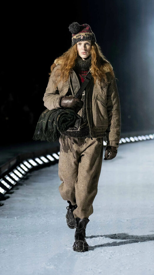 이후 펼쳐진 쇼는 미국 패션쇼에서 좀처럼 보기 힘든 규모였다. 유럽 럭셔리 하우스의 막대한 예산 덕분이었다. 흰색 수도복을 연상시키는 패딩을 입은 수십 명의 엑스트라가 숲에서 등장해 눈 언덕 위에 섰고, 지지 하디드가 이끄는 100여 명의 모델이 경사진 설원 런웨이를 따라 내려왔다. 모델들은 눈 위에서 접지력을 확보하기 위해 금속 마이크로스파이크가 장착된 신발을 착용했다. 마지 스타의 ‘Fade Into You’부터 데이비드 보위의 ‘Heroes’까지 히트곡이 이어지는 사운드트랙에 맞춰, 프린지 스웨이드 테크니컬 재킷, 울 스웨터, 청바지에 인디아나 존스풍 모자를 매치한 알파인 카우보이 스타일 스키웨어, 그리고 미러 고글과 브랜디드 스노보드를 갖춘 풀 스노 수트가 등장했다. 피날레 직전에는 미니 리퍼턴의 곡이 케이트 부시의 ‘Running Up That Hill’로 이어졌고, 차가운 밤공기를 가르는 볼륨으로 울려 퍼졌다. “자기야, 우리 서로의 경험을 바꿔보자.” 그리고 우리는 실제로 그 경험을 교환했다.
