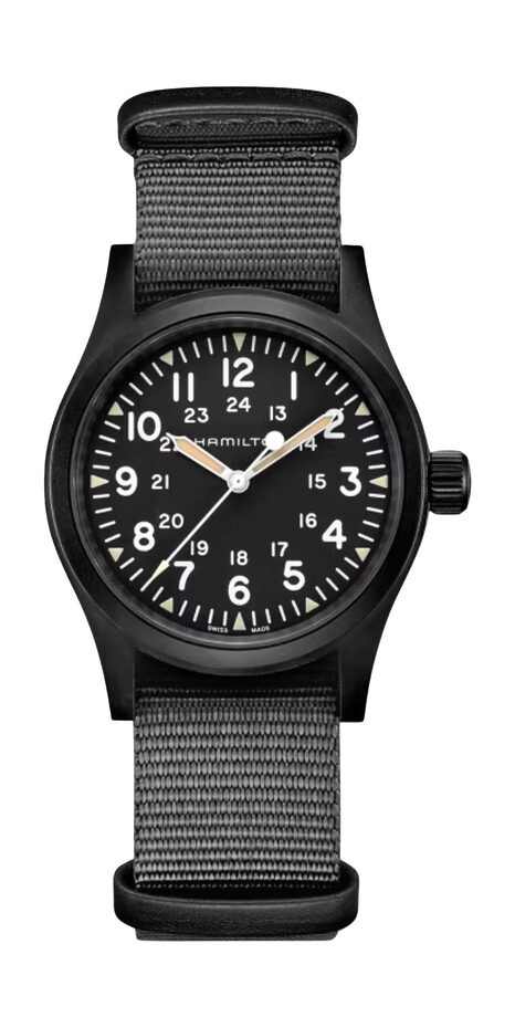 해밀턴의 대표 필드 워치는 원래 가죽도 잘 어울리지만, 러기드한 나토를 채우면 훨씬 자연스럽다. 브러시드 케이스와 심플한 다이얼이 나일론과 잘 맞아 여행·데일리용으로 부담 없다.